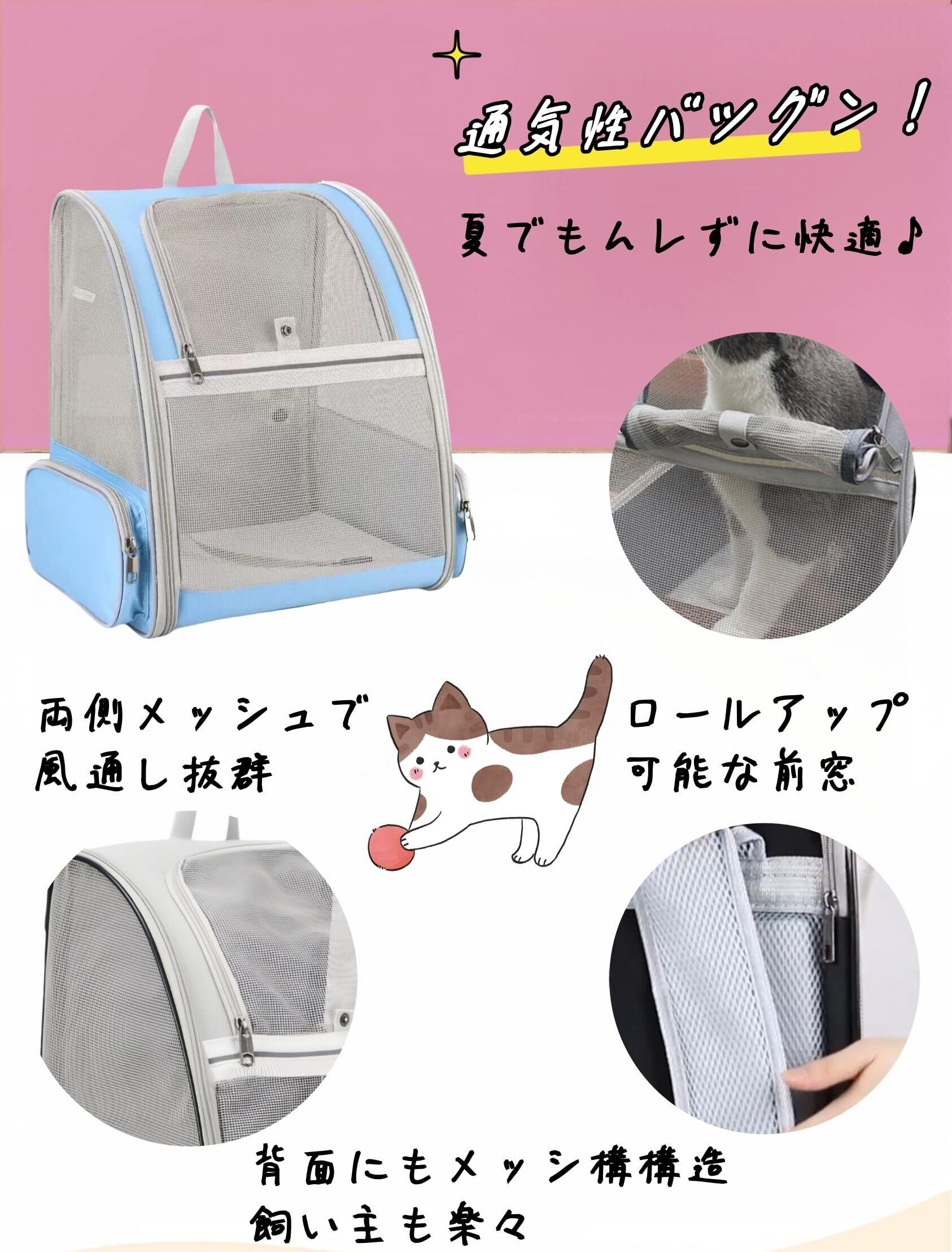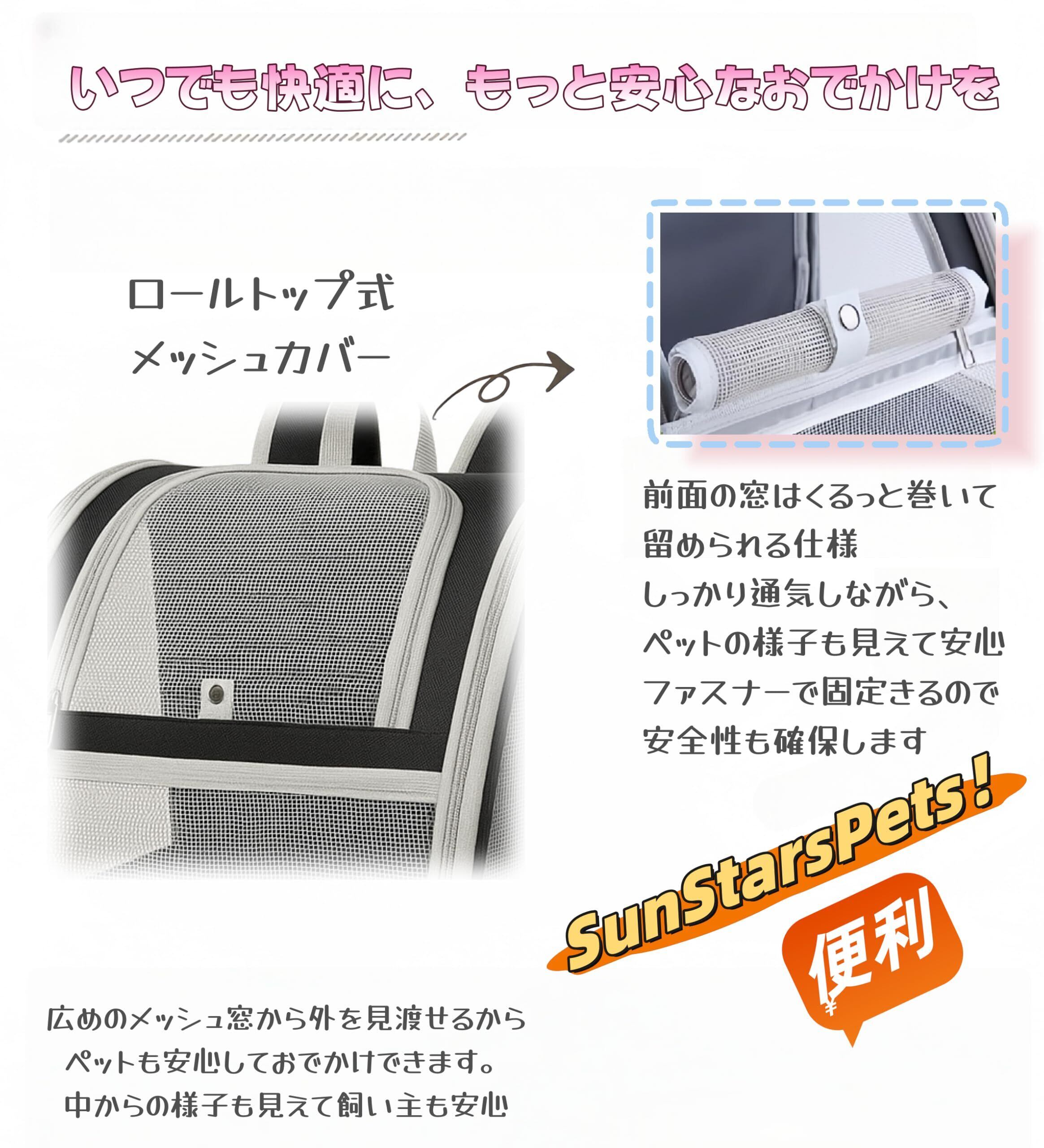 「通気性抜群のメッシュ設計」ペットキャリー全体に広いメッシュ窓を採用しており、通気性を高め、猫や小型犬に常に新鮮な空気を提供します。メッシュ窓のデザインにより、愛猫がリラックスしながら外の景色を楽しめる視界も確保。さらに、上部のジッパー部分を開けば、ペットが頭を出すことができ、安心して旅行や散歩に出かけられます