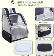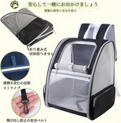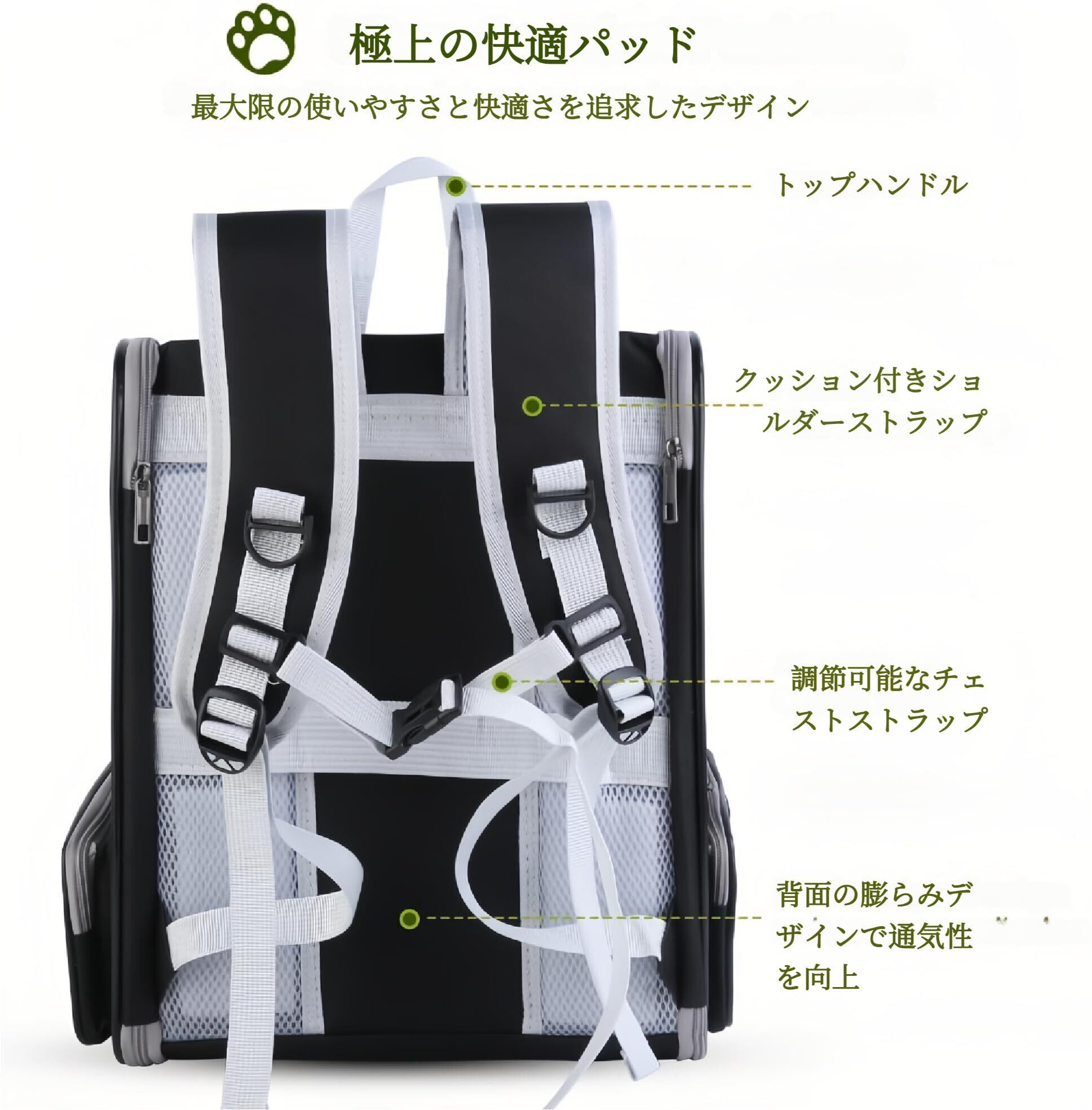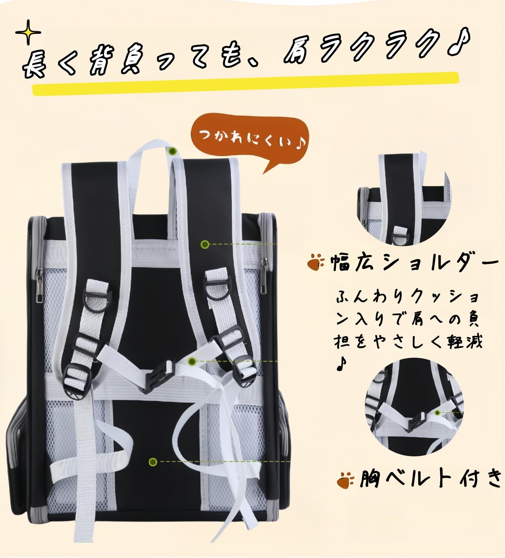 「両手が自由になるリュックタイプ」肩への負担を軽減するため、広めの肩ストラップと調整可能なチェストストラップを装備したリュックタイプのデザイン。ペットの体重を均等に分散し、自転車移動や長時間の使用でも疲れにくい設計になっています。上部には持ち手ハンドルも付いており、リュックとしても手提げとしても使える便利な多機能バッグです
