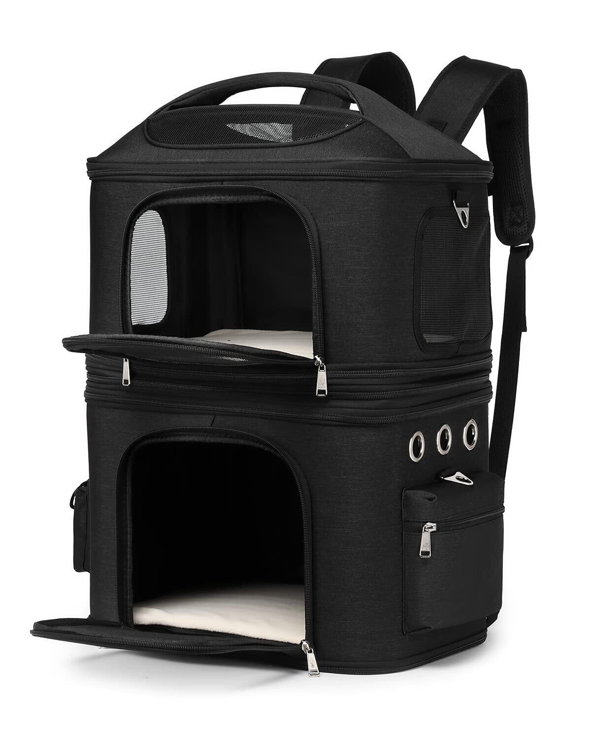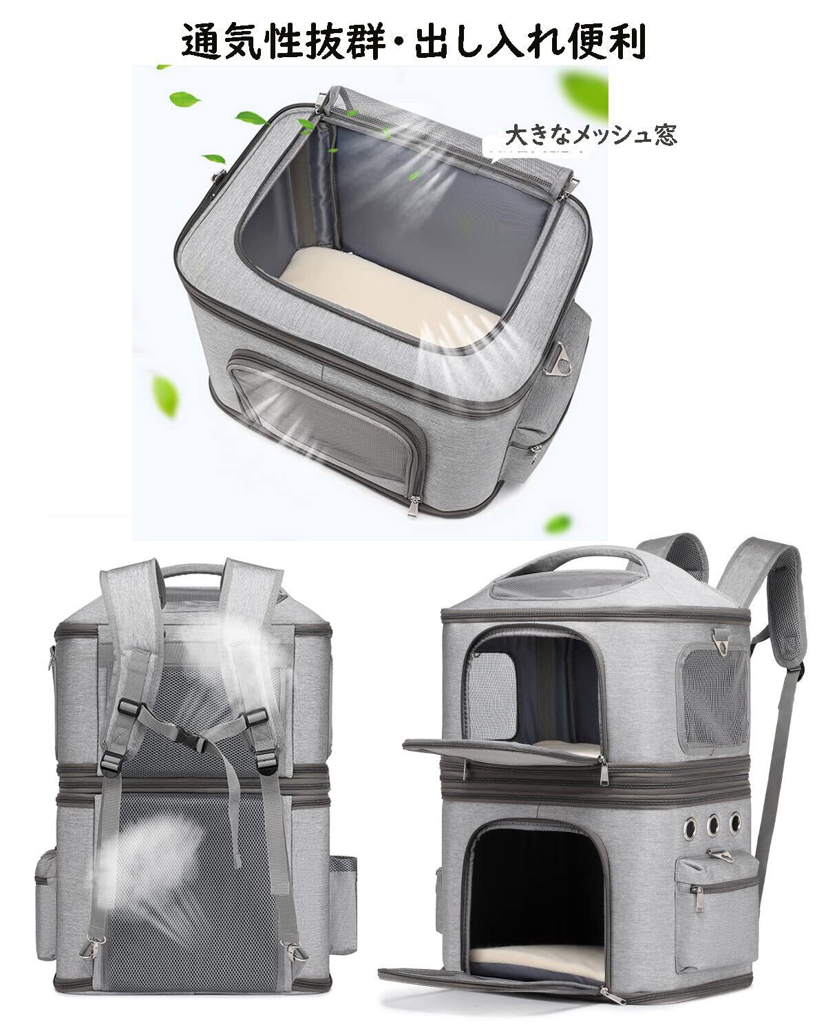CHINSUKIDA 猫 2匹 リュック 分離可 キャリー 2層 ペット キャリーバッグ 小型犬 ソフトクレート 折りたたみ可 マット付き 2way 通院用 (ブラック)