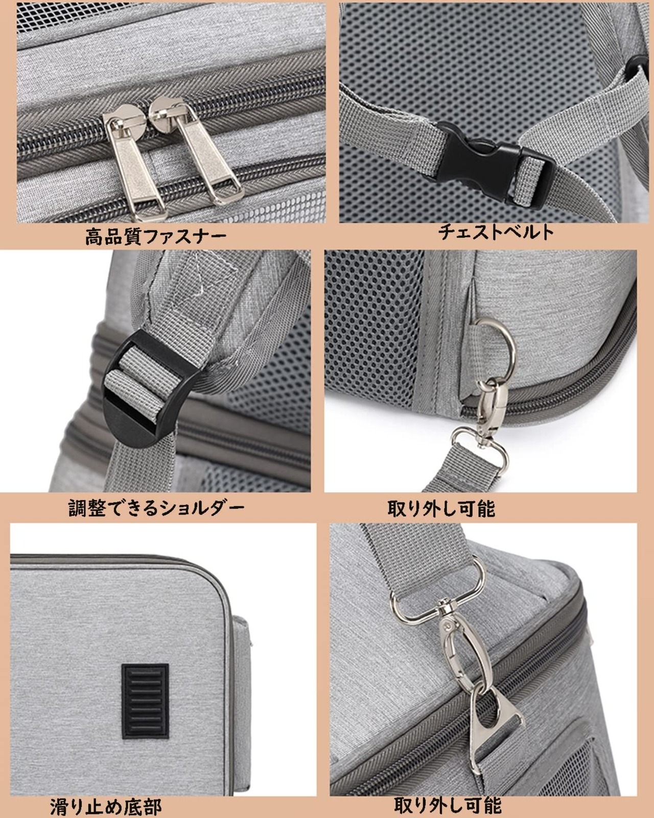 「キャリー本体にもこだわりました。」①中の広々としたスペースをしっかり確保。ワンちゃんとニャンコはゆったりでき、移動中ものびのびとできます。②キャリーの両サイドにポケットがあり、お出かけ用におもちゃやおやつなどを入れられます。③メッシュ素材で通気性拔群 ④底面滑り止め付き。⑤ウェストベルトが体の負荷を分散でき、長時間背負っても楽に対応できます。両方の肩ひもを繋ぐように胸元に付けられているチェストベルトは背負ったペットリュックが左右に揺れないようにすることで重心を安定させます。