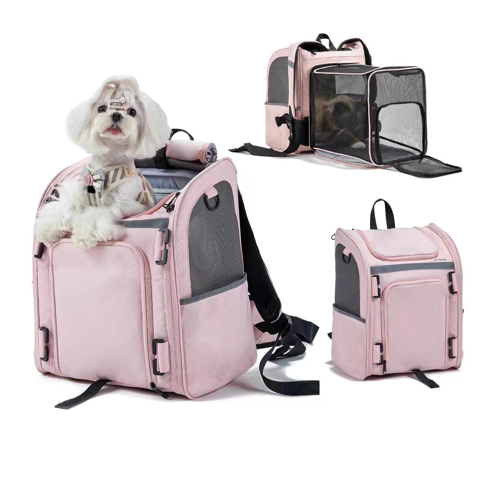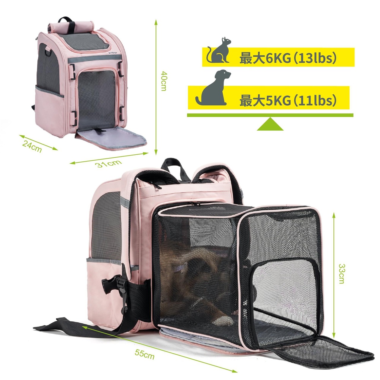 Wildgogo 拡張式ペットキャリー 折りたたみ可 着脱式リュック対応 小型犬・猫用(6kg以下) 飛び出し防止 通気性メッシュ 車載可 旅行/避難/アウトドアに最適 (ピンク)