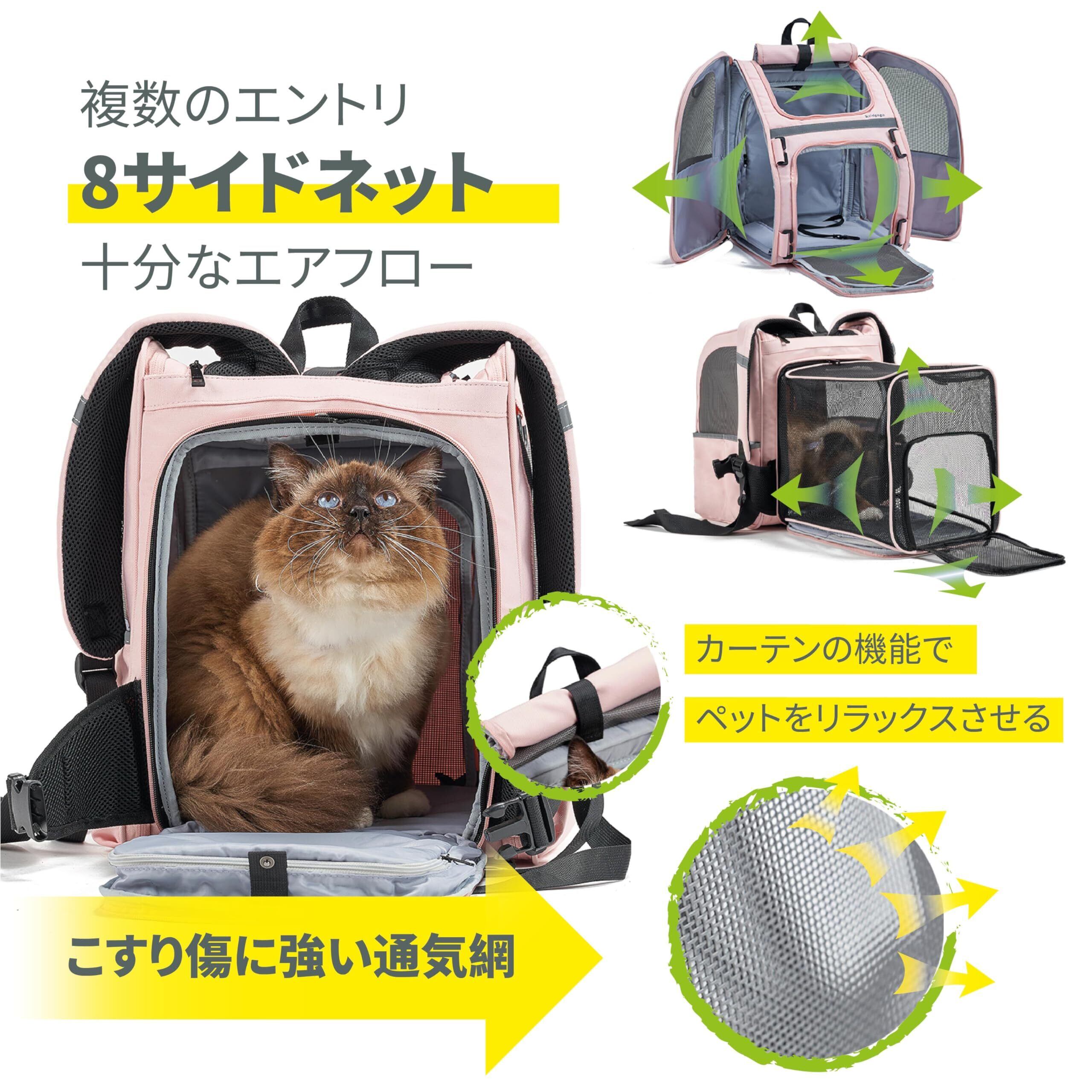 【通気性と視認性】 猫用バックパックの前面、上部、側面に(拡張しているかいないかにより)4-8の破れにくい通気性メッシュがあり、よりよい換気と中のペットを見る利便性を実現。ペットキャリーバックパックは、上部が開けられ、猫/犬が頭を突き出すことができます。