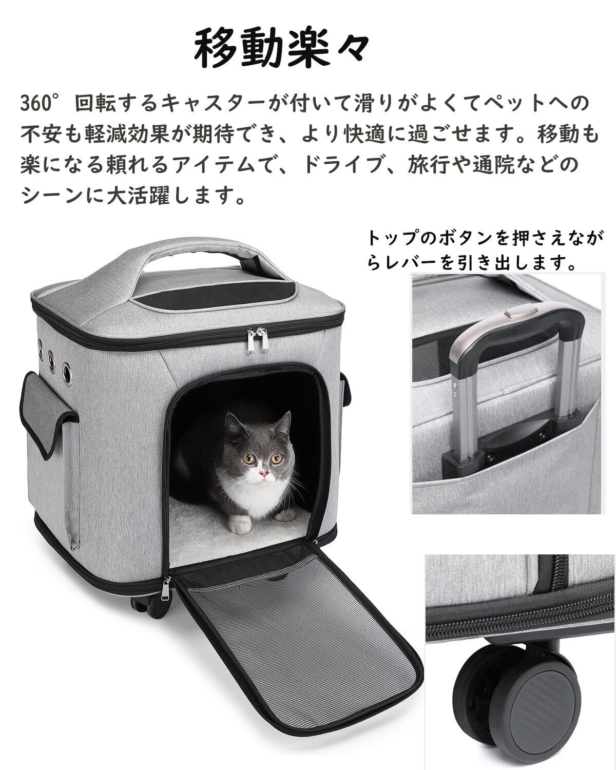 【移動楽々】ペットのお出かけに便利なキャリーです。360°回転するキャスターが付いて滑りがよくてペットへの不安も軽減効果が期待でき、より快適に過ごせます。移動も楽になる頼れるアイテムで、ドライブ、旅行や通院などのシーンに大活躍します。