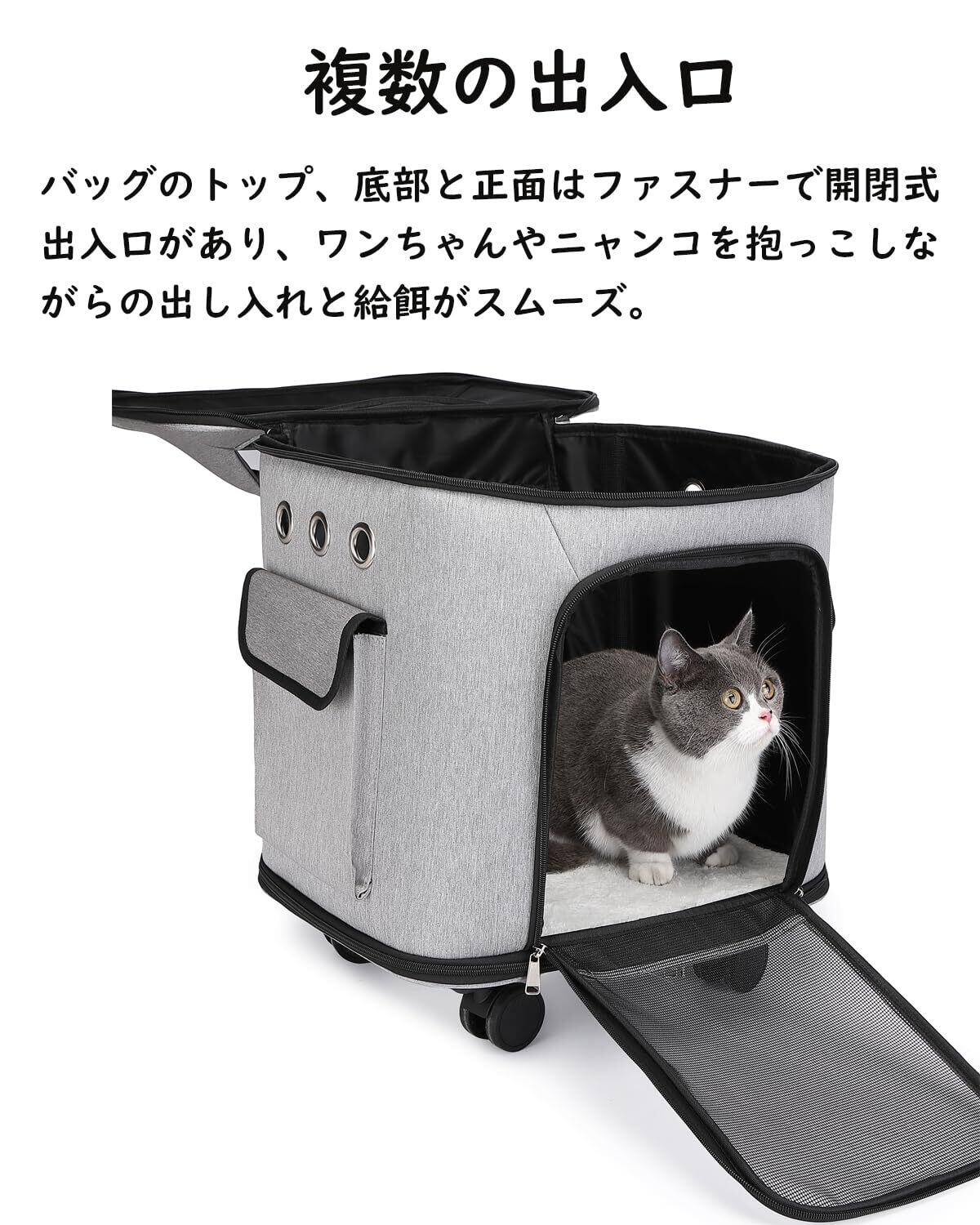 【複数の出入口】バッグのトップ、底部と正面はファスナーで開閉式出入口があり、ワンちゃんやニャンコを抱っこしながらの出し入れと給餌がスムーズ。