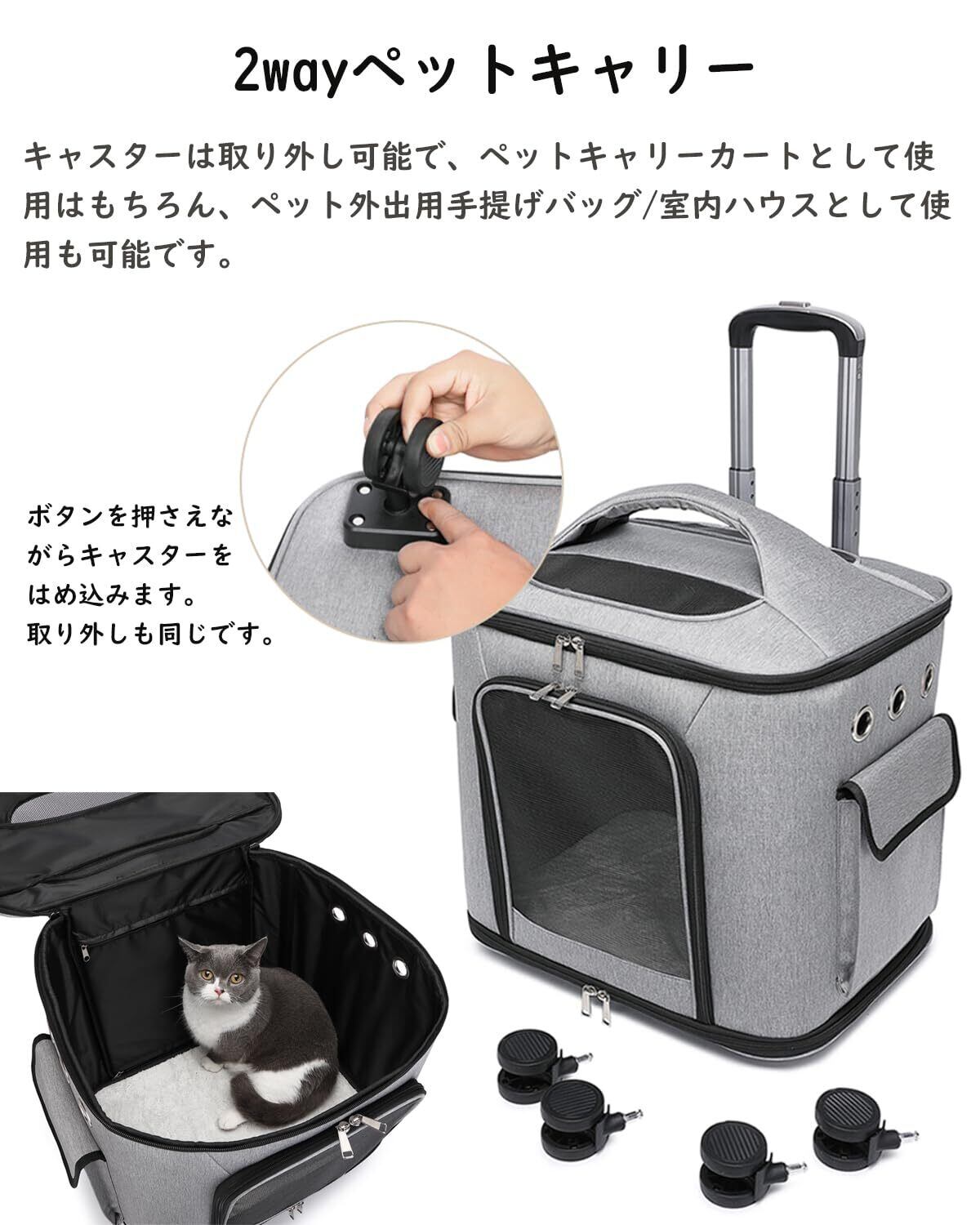 【2wayペットキャリー】キャスターは取り外し可能で、ペットキャリーカートとして使用はもちろん、ペット外出用手提げバッグ/室内ハウスとして使用も可能です。