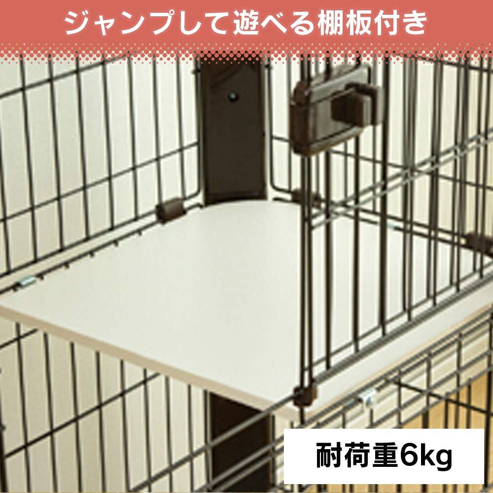 【商品説明】:インテリアにも合う可愛らしいデザインのケージ。愛猫の飼育に適した、高さのある2段タイプのケージです。開閉に場所をとらないスライド扉です。2段タイプには愛猫が楽しく遊べる棚板とハンモック付きです。(2段:ハンモック1枚、棚板1枚付き)