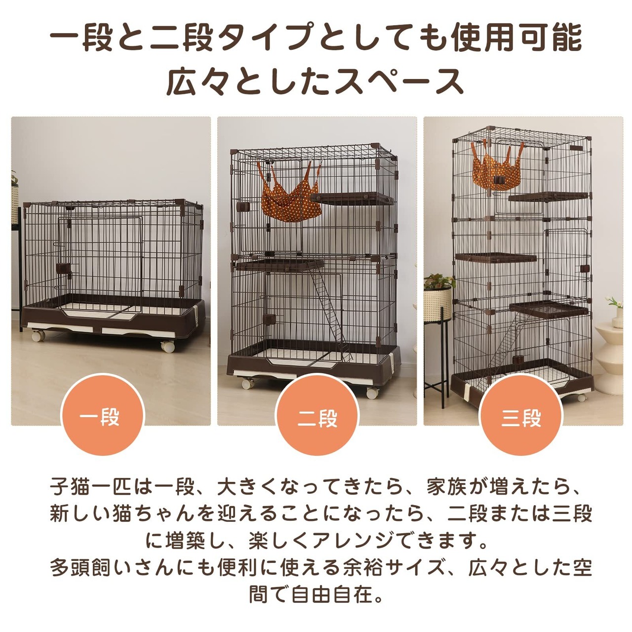 【多頭飼いさんにも便利に使える余裕サイズ】一段タイプとしても使用可能:子猫一匹は一段、大きくなってきたら、家族が増えたら、新しい猫ちゃんを迎えることになったら、二段に増築し、楽しくアレンジできます。