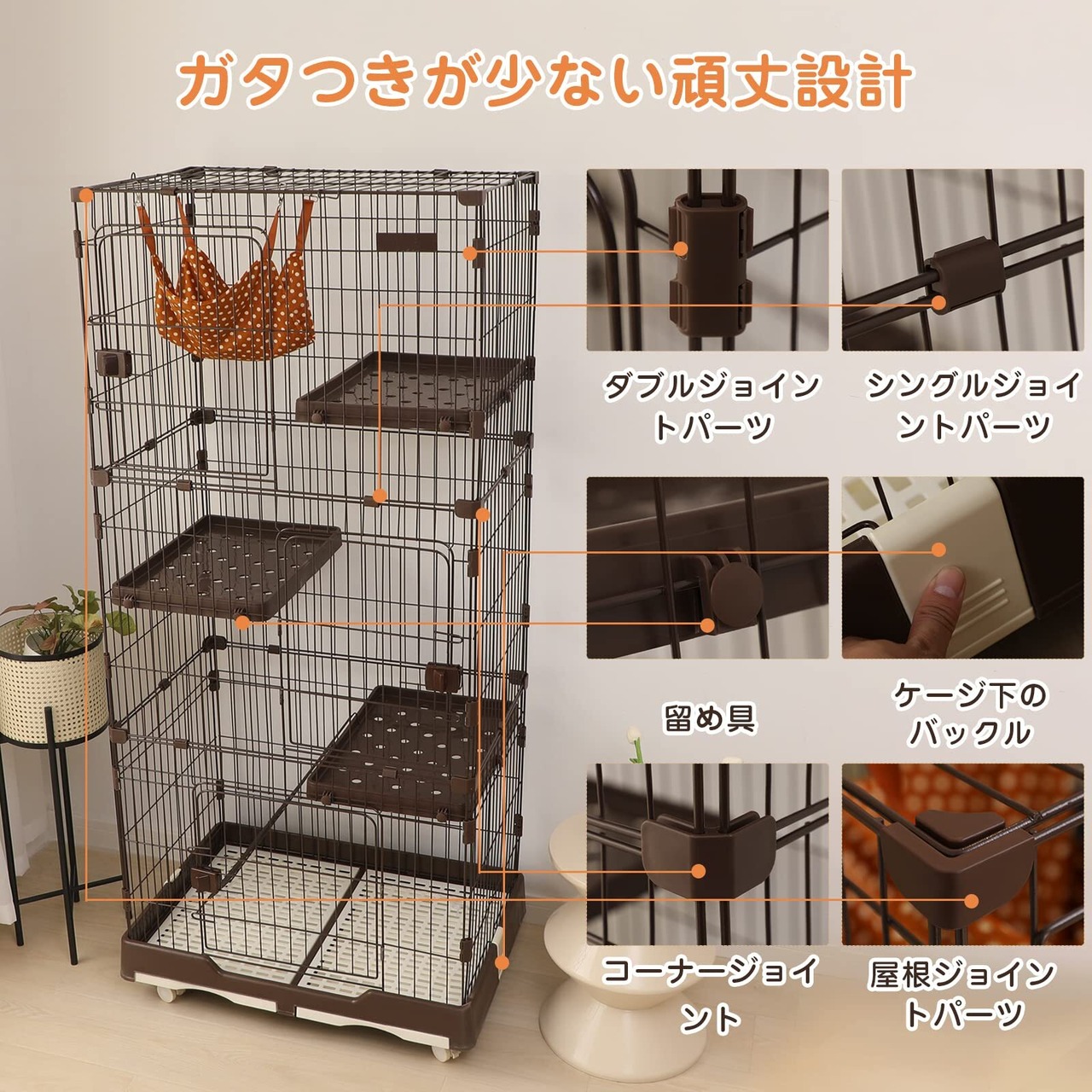 【移動に便利なキャスター付き】キャスターは全部で4個付きます。内2個はストッパー付きなので、使用時にはケージが動かないようにロックすることができます。キャスター付きなので、掃除の時は移動楽々!安定性にご心配なく!