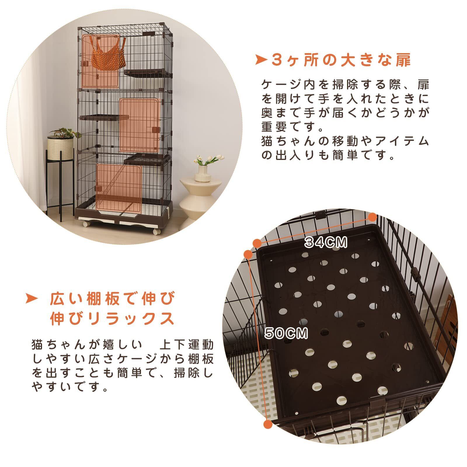 PETTOM 猫ケージ キャットケージ 幅82cm 2/3段 ペット 猫 キャットゲージ キャット タワー 収納 キャスター 付 脱走防止扉 頑丈 檻 ねこ ネコケージ コンパクト ハンモック 多頭飼い (三段(82*57*179CM))