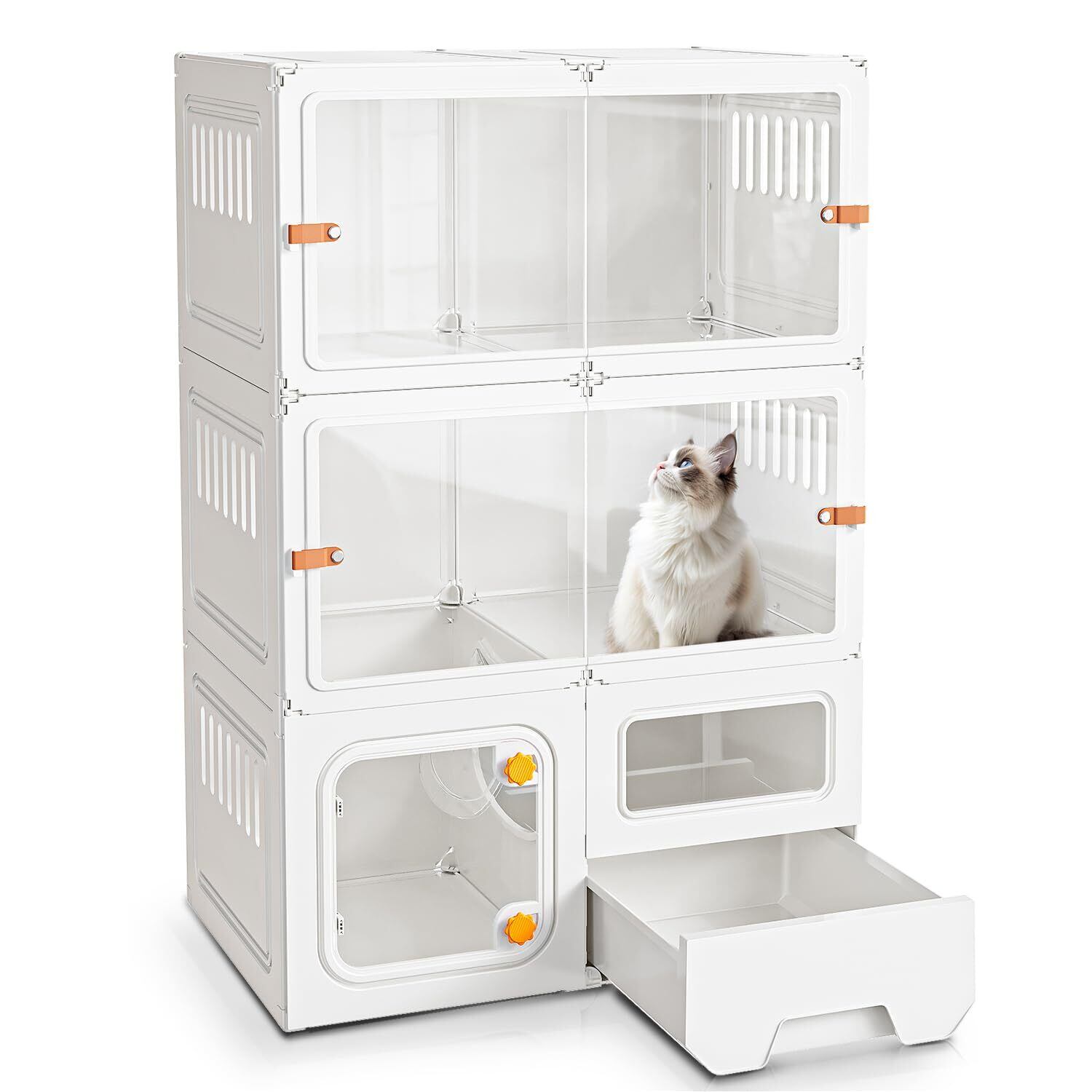 Topzoo 猫 ケージ トイレ付き 2段 トイレ一体型 防臭 飛散軽減 透明引き戸 幅70×奥行き45×高さ105cm キャットケージ 猫用ケージ 子猫 スリム おしゃれ スコップ付き クリア コンパクト 脱走防止 日本語説明書付き ホワイト