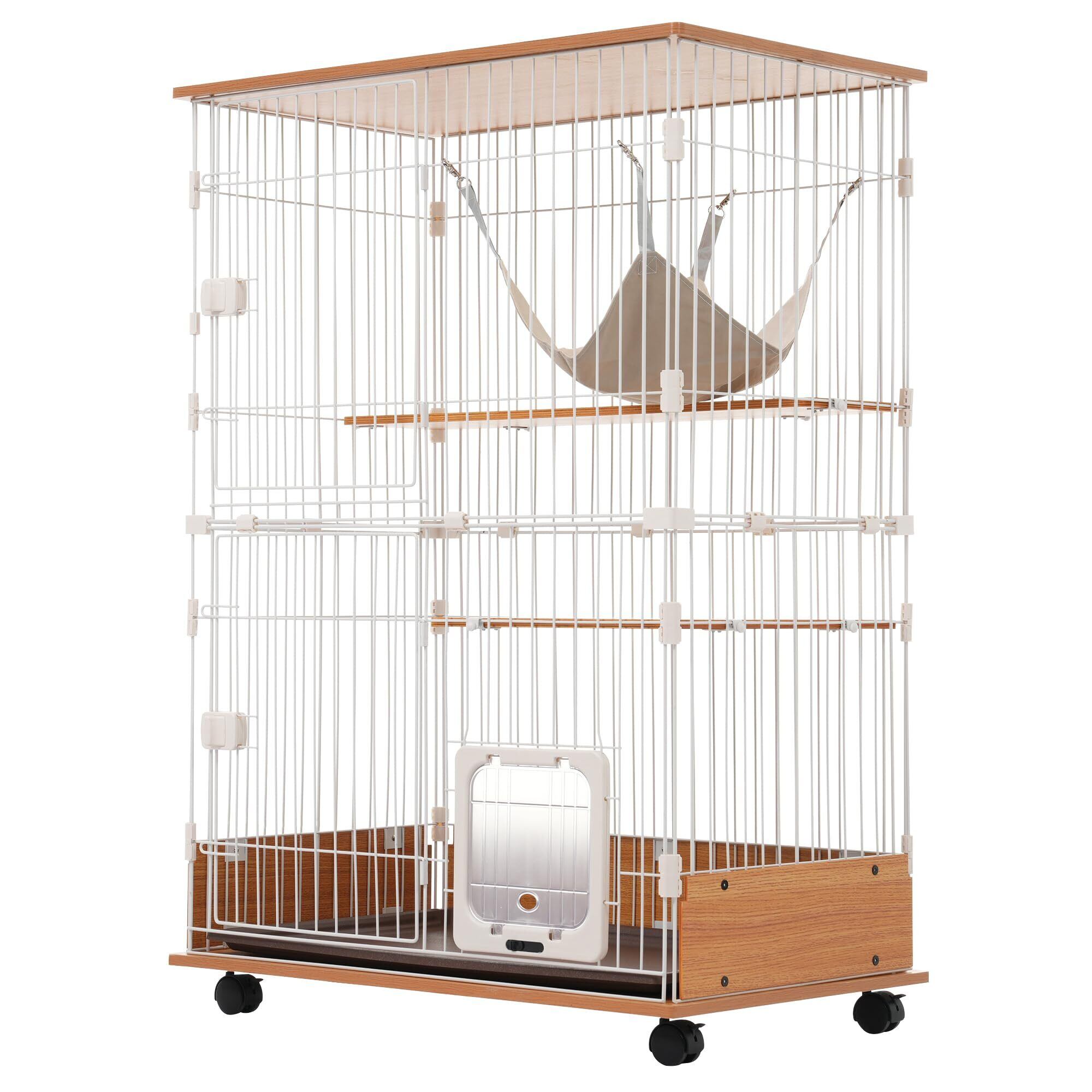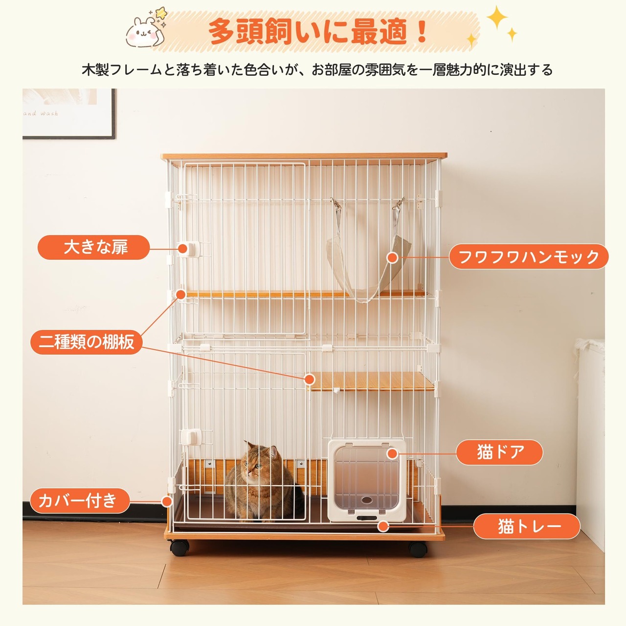 【在庫セール】BTM 猫 ケージ 飛び散り防止カバー付き キャットケージ 木製フレーム 猫ゲージ キャットハウス 猫用 ハンモック付き 引出し式トレー付 頑丈設計 大型 ワイド扉 多頭飼い 留守番 保護 脱走防止 組立簡単 おしゃれ | wakuwakuland