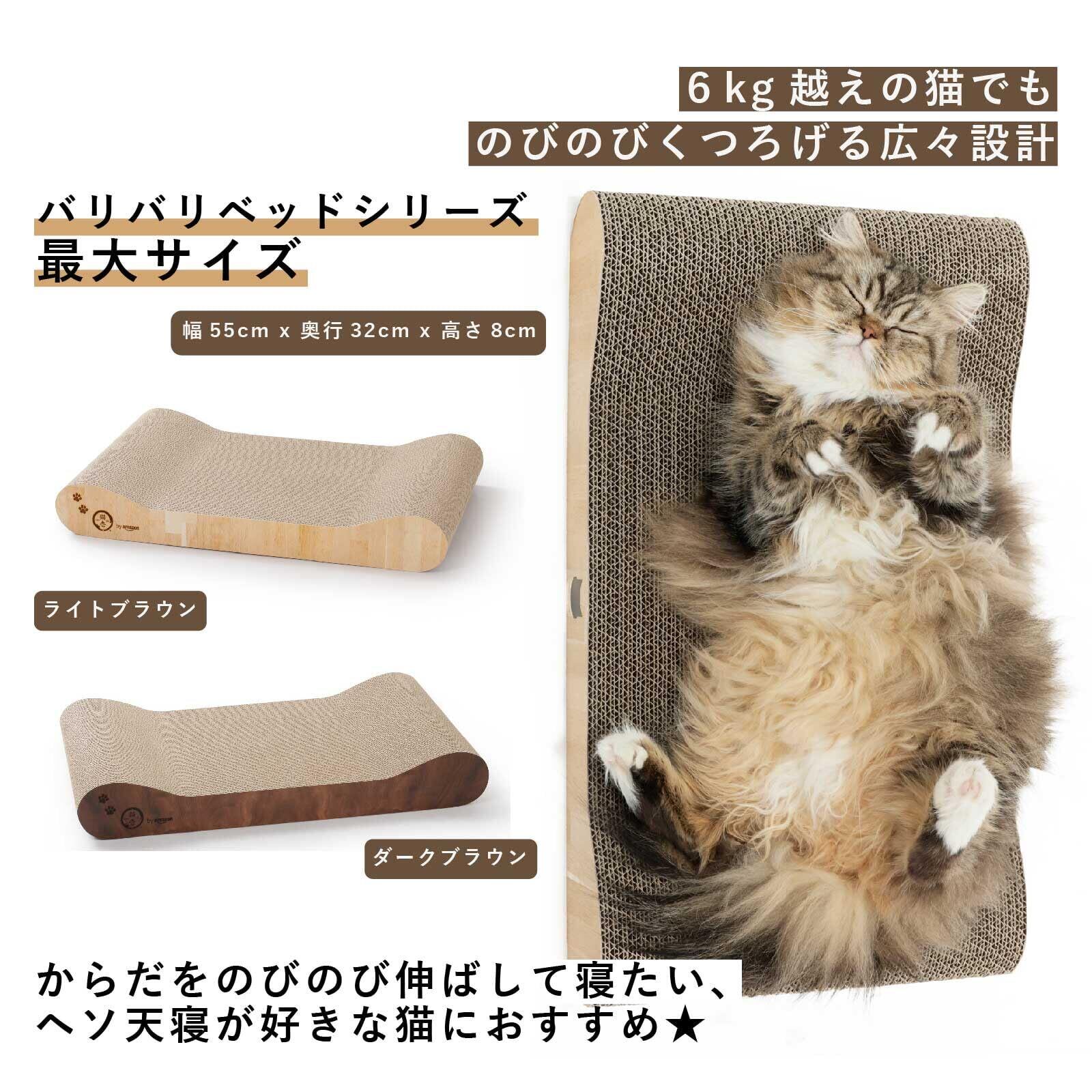 【6kg越えの大きめ猫ちゃんも広々ゆったりサイズ】バリバリベッドラウンジは、奥行55cm幅32cmの猫壱のバリバリベッドシリーズの中でも最大サイズ。 くるんと丸くなって寝るよりも、身体をのびのび伸ばして寝たい猫やへそ天寝が好きな猫にぴったりの形です。 カラーはライトブラウンとダークブラウンの2種類。インテリアや猫の毛色に合わせてお好きなカラーをお選びいただけます。 【ベッドの左右についた枕が気持ちいい】バリバリベッドラウンジの左右は、猫が顎を乗せたり、頭を乗せたりするのにぴったりな枕付き。 定番バリバリベッドの左右と比較すると角が丸く、角度がよりなめらかになっています。リラックスしてとろんとした猫のやわらかな体が優しくフィットします。 【植物由来の糊使用】猫がつめとぎをした後、手や肉球をなめても心配がないよう、ダンボールを貼り合わせる際に使用している糊は、とうもろこしを主原料とした植物由来の糊を使用しています。 【有害物質ゼロ!こだわり抜いた原材料】つめとぎ部分に使用しているダンボールは、原料の100%が紙です。内10%はニュージーランド産原パルプ紙を使用。 大切な猫に使用するつめとぎなので、品質にはとことんこだわりました。高品質なので嫌なニオイが少なく、とぎカスもでづらくなっています。 【高密度ダンボールで長持ち】ダンボールは薄いダンボールを貼り合わせています。薄いタイプを使用することで密度が高くなり、猫のとぎ甲斐アップだけでなく、耐久性も持たせています。
