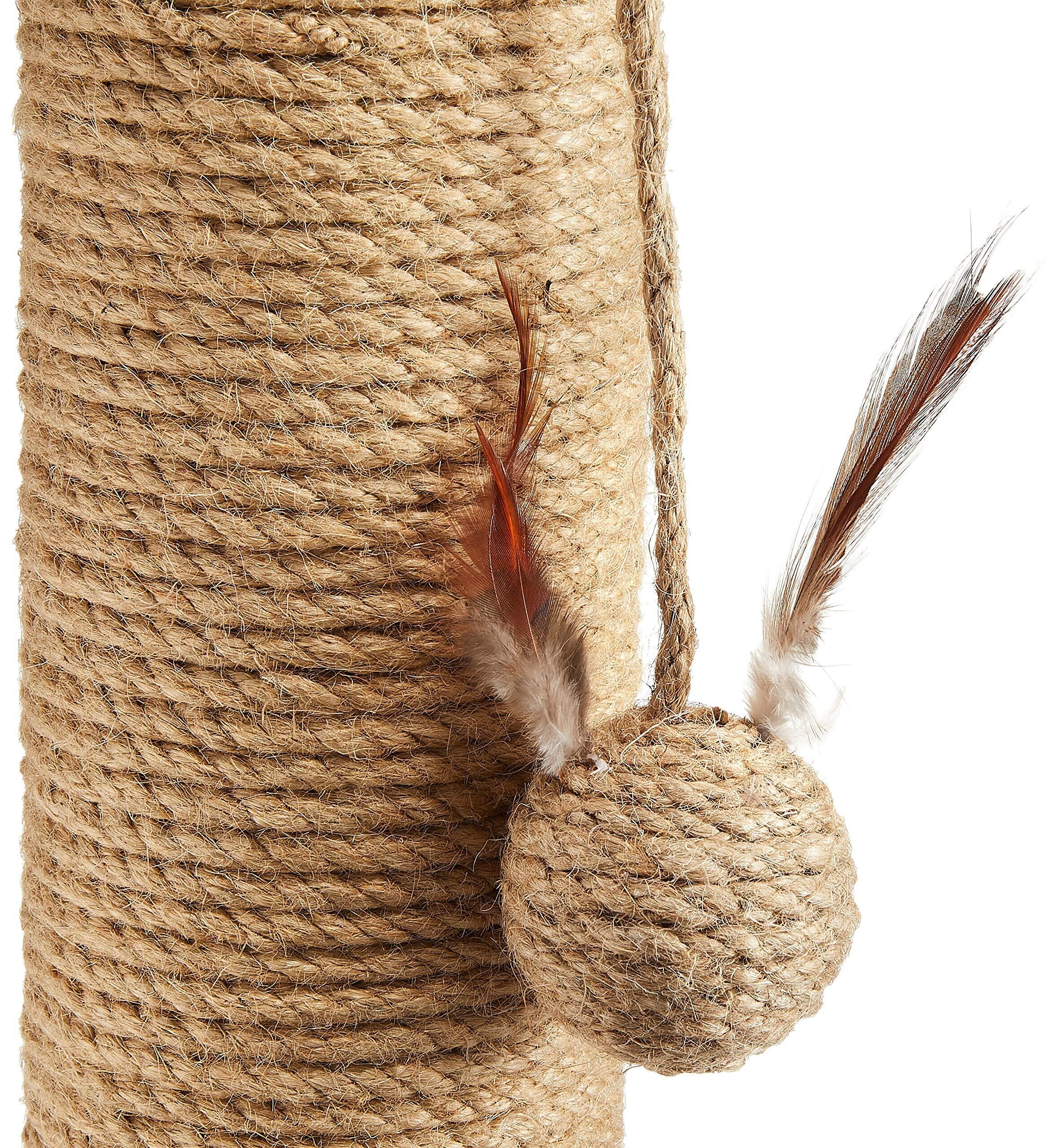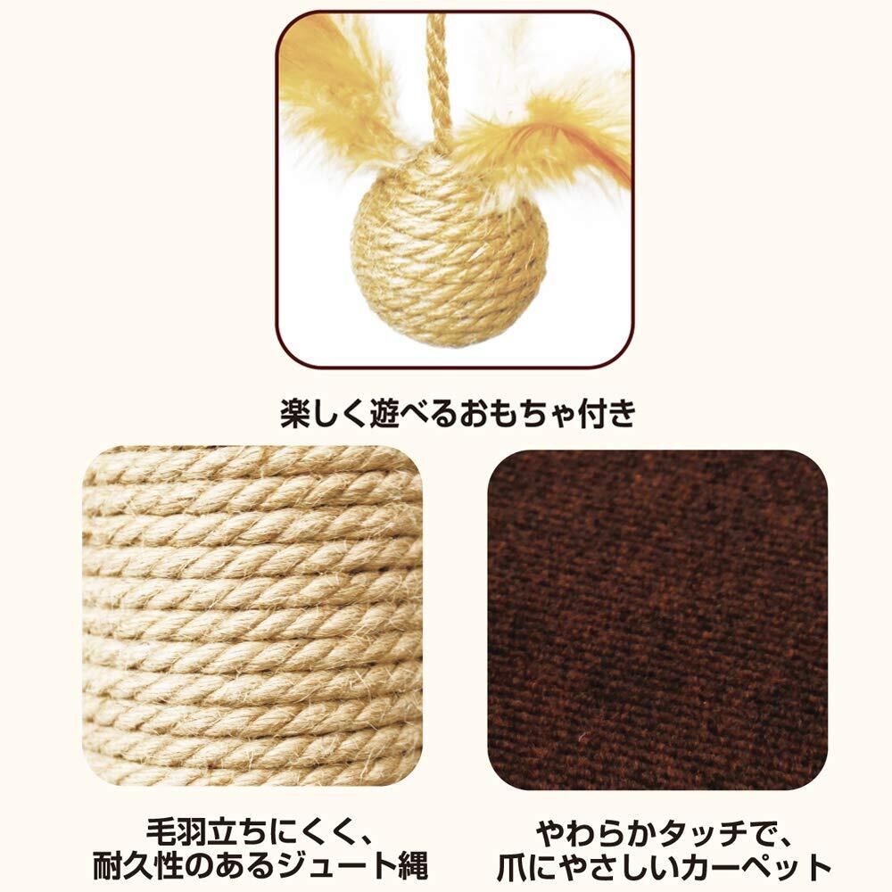 ・子猫から成猫まで使えるコンパクトサイズの猫用ファニチャー。・毛羽立ちにくく、耐久性があるジュート縄まき柱とやわらかタッチで爪にやさしいカーペット貼り柱と床、どこでもツメミガキができる。替柱の販売もある。・鳥の羽付きのジュート縄まき玩具は振るとカラカラ鳴り、猫ちゃんを魅了する。・高さ約60cm。グーンと伸びて爪を引っかけるのが好きな子も満足。・ちょっとしたスペースに置くことができるコンパクトサイズ。初めて猫ちゃんを飼う方にもおすすめ。