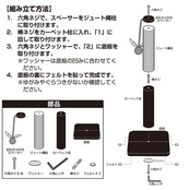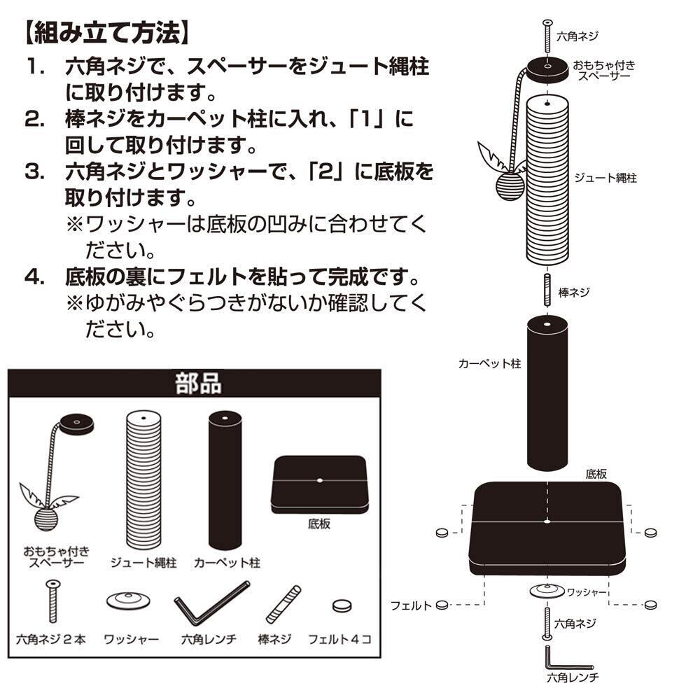 ・部品をお確かめください。【組み立て方法】1)六角ネジで、スペーサーをジュート縄柱に取り付けます。 2)棒ネジをカーペット柱に入れ、「1」に回して取り付けます。 3)六角ネジとワッシャーで、「2」に底板を取り付けます。※ワッシャーは底板の凹みに合わせてください。 4)底板の裏にフェルトを貼って完成です。※ゆがみやぐらつきがないか確認してください。