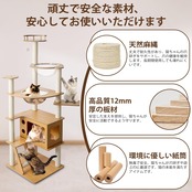 【安全性を重視】私たちは猫の安全を最優先に考え、厚みのある頑丈な木材と安定感のある構造を採用しました。底板には工夫を凝らしたデザインを取り入れ、キャットタワー全体の安定性をさらに向上させています。大型の猫でも安心して遊べる仕様です。直径6.5cmのサイザル麻ポールは、猫の爪研ぎに最適で、家具や壁へのダメージを防ぎます。また、多頭飼いにも対応した設計のため、複数の猫が同時に使用しても問題ありません。