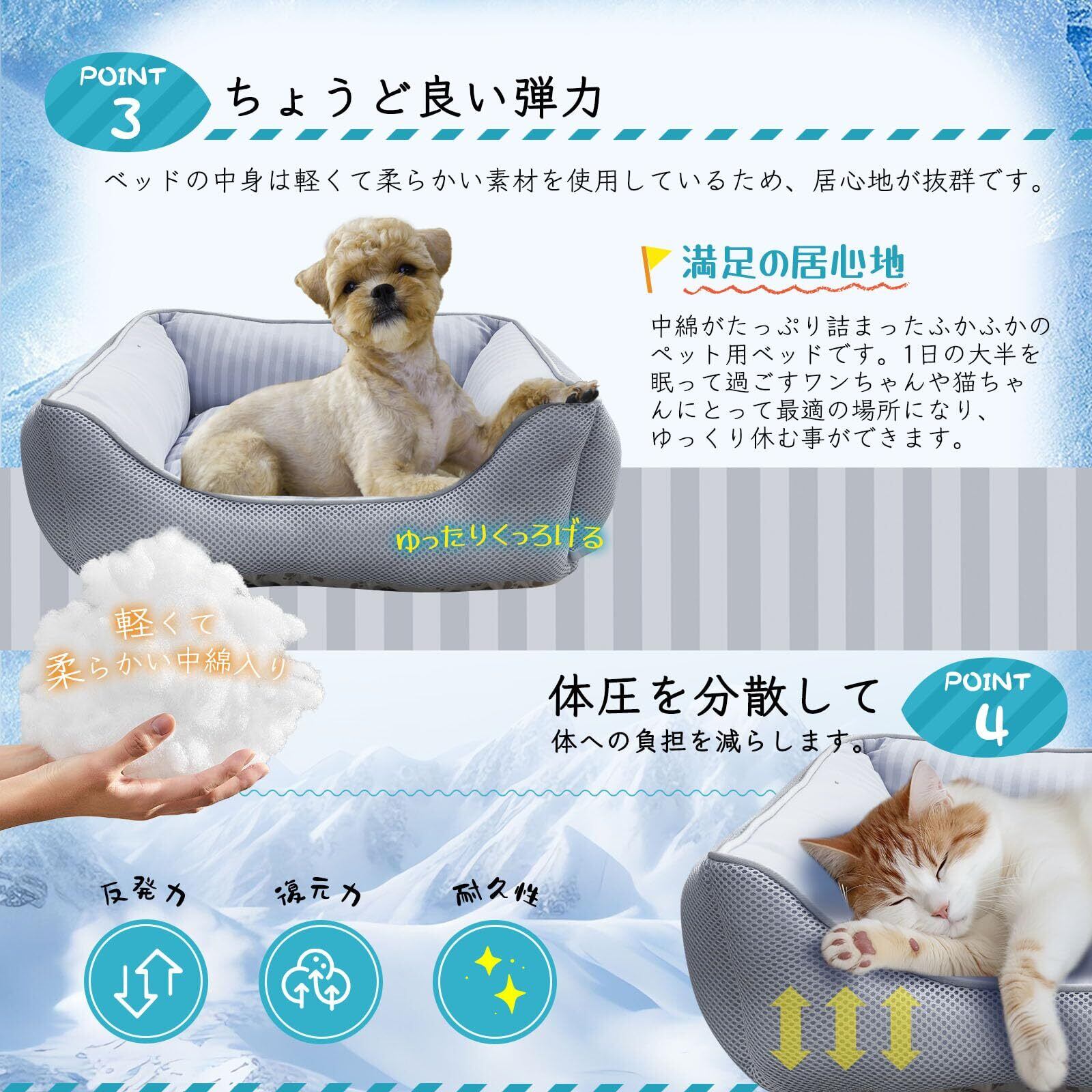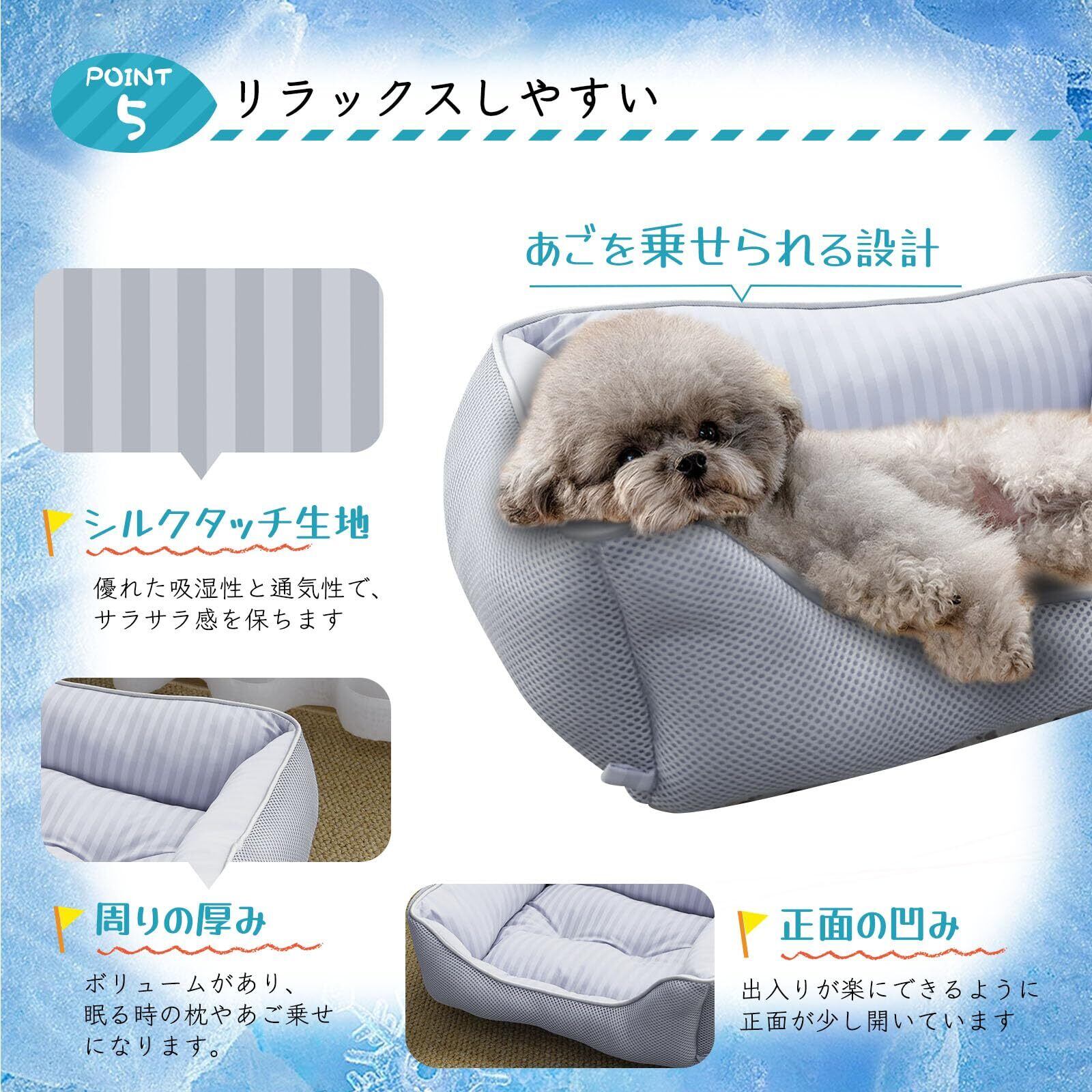 【優しいデザイン】クッション部分はひんやり柔らかく、ソファの端は少し固めるため、頭やあごが乗せやすく寝心地が良い。ベッド裏面に厚い滑り止め付きです。滑りやすいフローリングの上に置いいたときに、ペットがペッドに飛び込んでもすべらないので安心です。