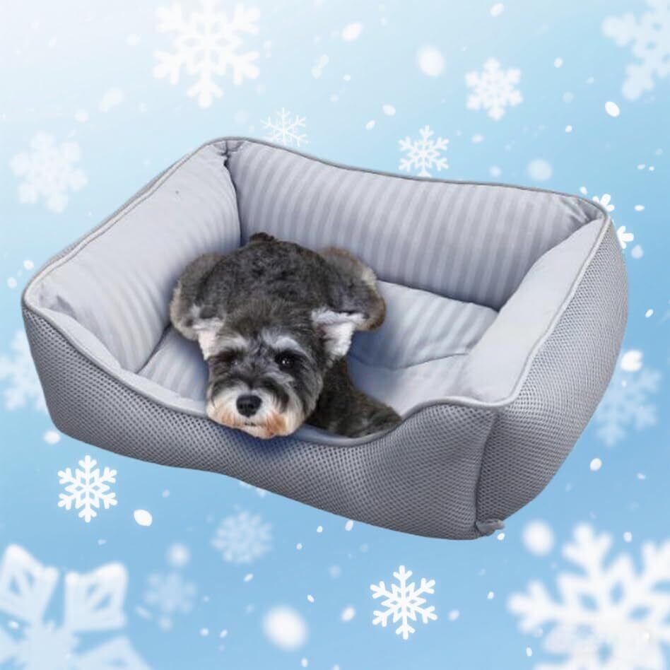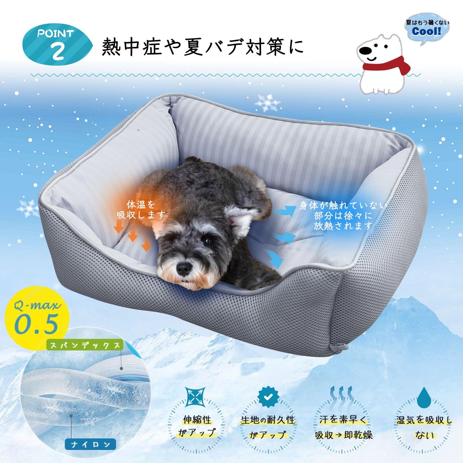 【熱中症や夏バデ対策に】犬や猫の熱中症及びクーラー病防止のため、ペットベッドの座面は夏の寝具と同じ品質の接触冷感生地(Q-MAX 0.5)を採用しました。肌が生地に触れた瞬間ひんやり。扇風機などと併用すると、冷感効果はだいぶアップになりますし、電気代の抑えにもなります。