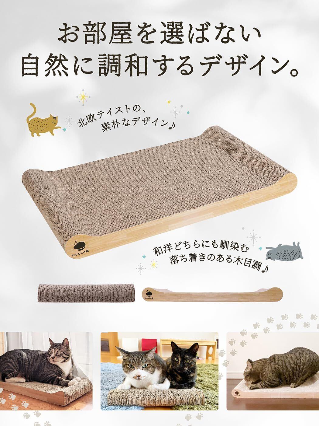 【 耐久性 】通常の段ボールの10倍の強度を誇る4層強化段ボールを使用しているので一般的な爪とぎより長持ち。だからカスが出にくい【猫ちゃんのからだにフィット】どちらの面も絶妙な角度のカーブで猫のやわらかいからだにフィットします。