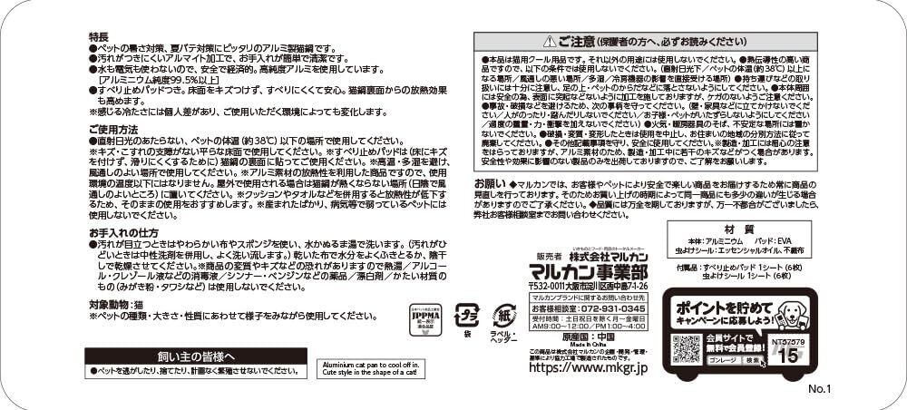 ・ペットの暑さ対策、夏バテ対策にピッタリのアルミ製猫鍋です。 ・汚れがつきにくいアルマイト加工で、お手入れが簡単で清潔です。 ・水も電気も使わないので、安全で経済的。高純度アルミを使用しています。(アルミニウム純度99.5%以上) ・すべり止めパットつき。床面を傷つけず、すべりにくくて安心。猫鍋裏面から放熱効果も高めます。 ・ねこちゃんに安心なハーブの香りの虫よけシールつき。(お好みの場所に貼ってください。) ※感じる冷たさには個人差があり、ご使用いただく環境によっても変化します。