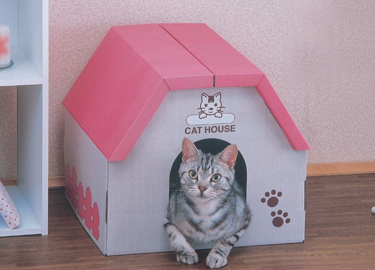 狭い場所に入りたがる猫の習性を考慮した、ユニークなデザインのハウス型のつめとぎBOXです。