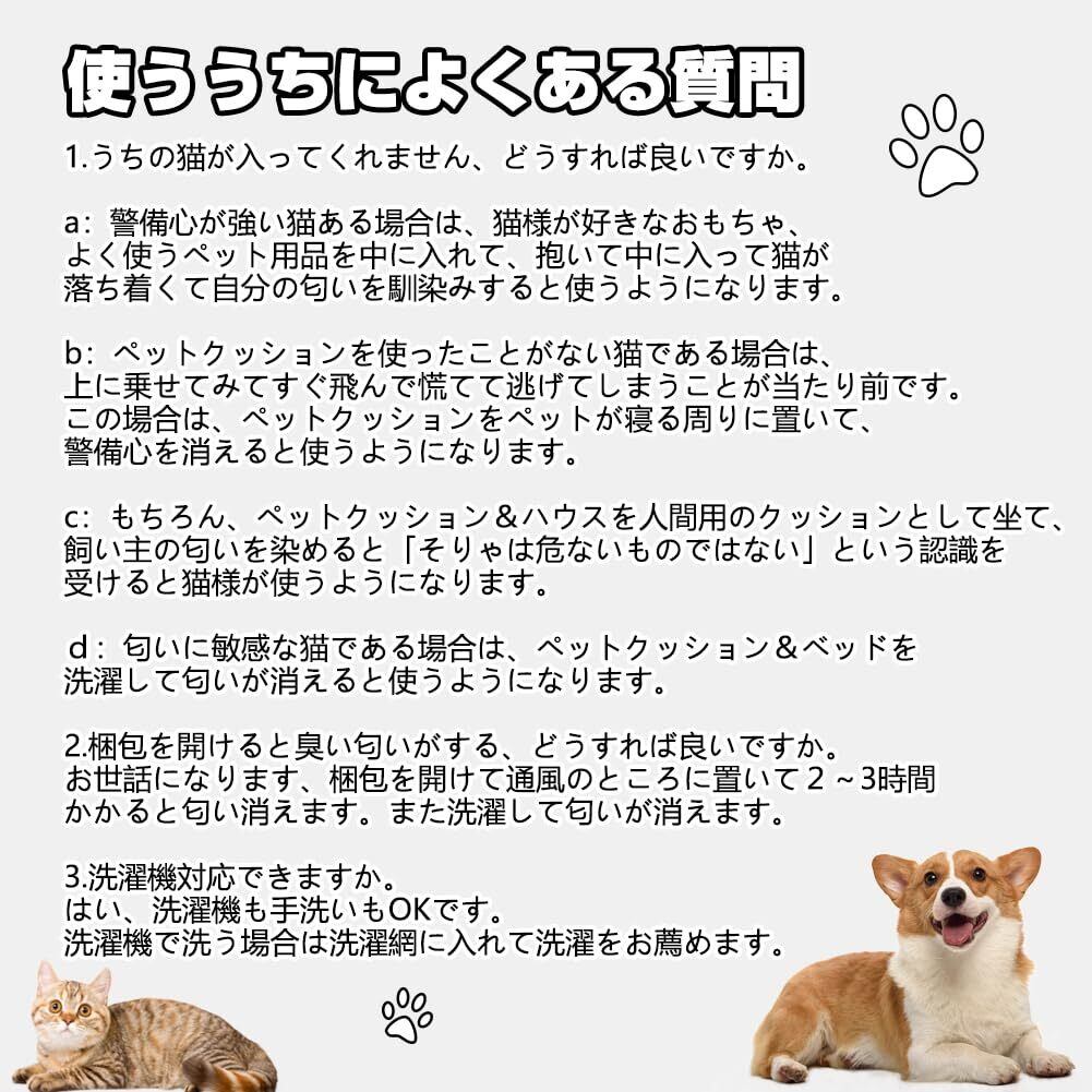 ➁猫の眠習みに合う暖かいペットベッドです。縁と底部にふわふわで弾力があるPP綿で詰まって柔か気持ち良いです。潜るが好きな猫なら、ハウスの中に入って、縁に顎のせしてぐっすり眠れます。潜るが大丈夫な子ではないなら、そのままハウスに横になってクッションとして使っても問題ありません。 ご注意:生地変更により、2025年1月15日後倉庫へ発送したコーヒー色の製品は色がもっと深くなってます。お客様の手元に届いたのは深い色のコーヒーになることがあります。(表面のコーヒー色の毛が多くなり、白色の毛が少なくなる、整体的に色が以っと深くなってます)、予めご了承ください。どうぞよろしくお願い致します。 使ううちにようある質問: ペットがどうしても入ってくれません、どうすれば良いですか。 a:警備心が強い猫ある場合は、猫様が好きなおもちゃ、よく使うペット用品を中に入れて、抱いて中に入って猫が落ち着くて自分の匂いを馴染みすると使うようになります。 b:ペットクッションを使ったことがない猫である場合は、上に乗せてみてすぐ飛んで慌てて逃げてしまうことが当たり前です。この場合は、ペットクッションをペットが寝る周りに置いて、警備心を消えると使うようになります。 c:もちろん、ペットクッション&ハウスを人間用のクッションとして坐て、飼い主の匂いを染めると「そりゃは危ないものではない」という認識を受けると猫様が使うようになります。 d:匂いに敏感な猫である場合は、ペットクッション&ベッドを洗濯して匂いが消えると使うようになります。