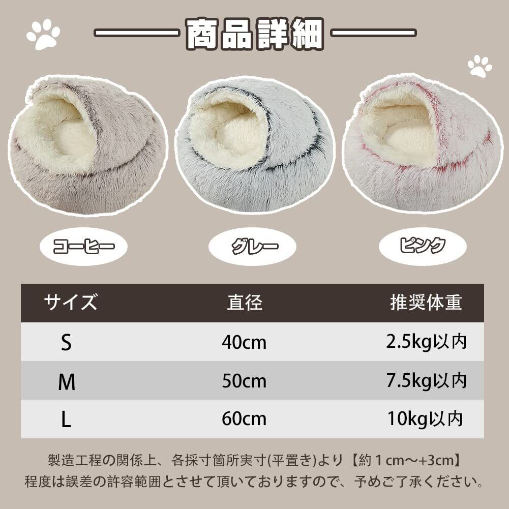 ⑤サイズ:S:直径40センチ、M:直径50センチ、L:直径60センチ3サイズあります。Sサイズは2.5kg以内の子猫、子犬が適用します。Mサイズは7.5kg以内の猫、小型の犬が適用します。Lサイズは10kg以内の猫、犬がお進めます。撮影環境やパソコンのディスプレイなどの影響により色が若干違って見える場合もあります。製造工程の関係上、各採寸箇所実寸(平置き)より【約1cm~+3cm】程度は誤差の許容範囲とさせて頂いておりますので、予めご了承ください。