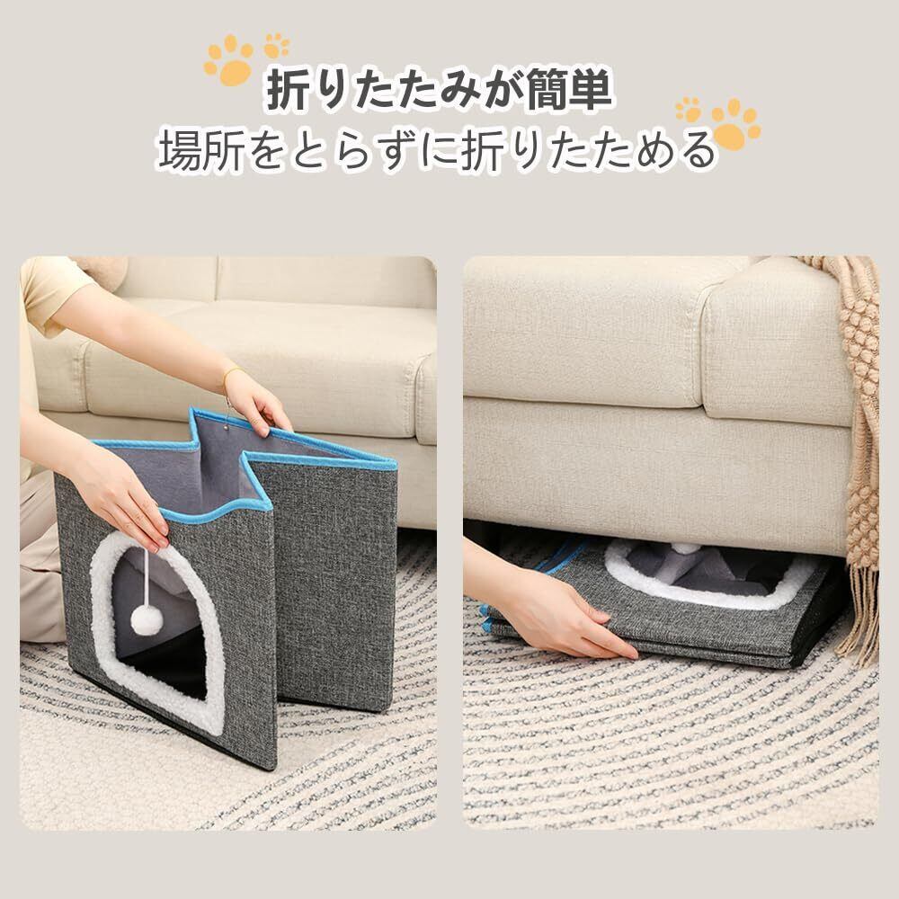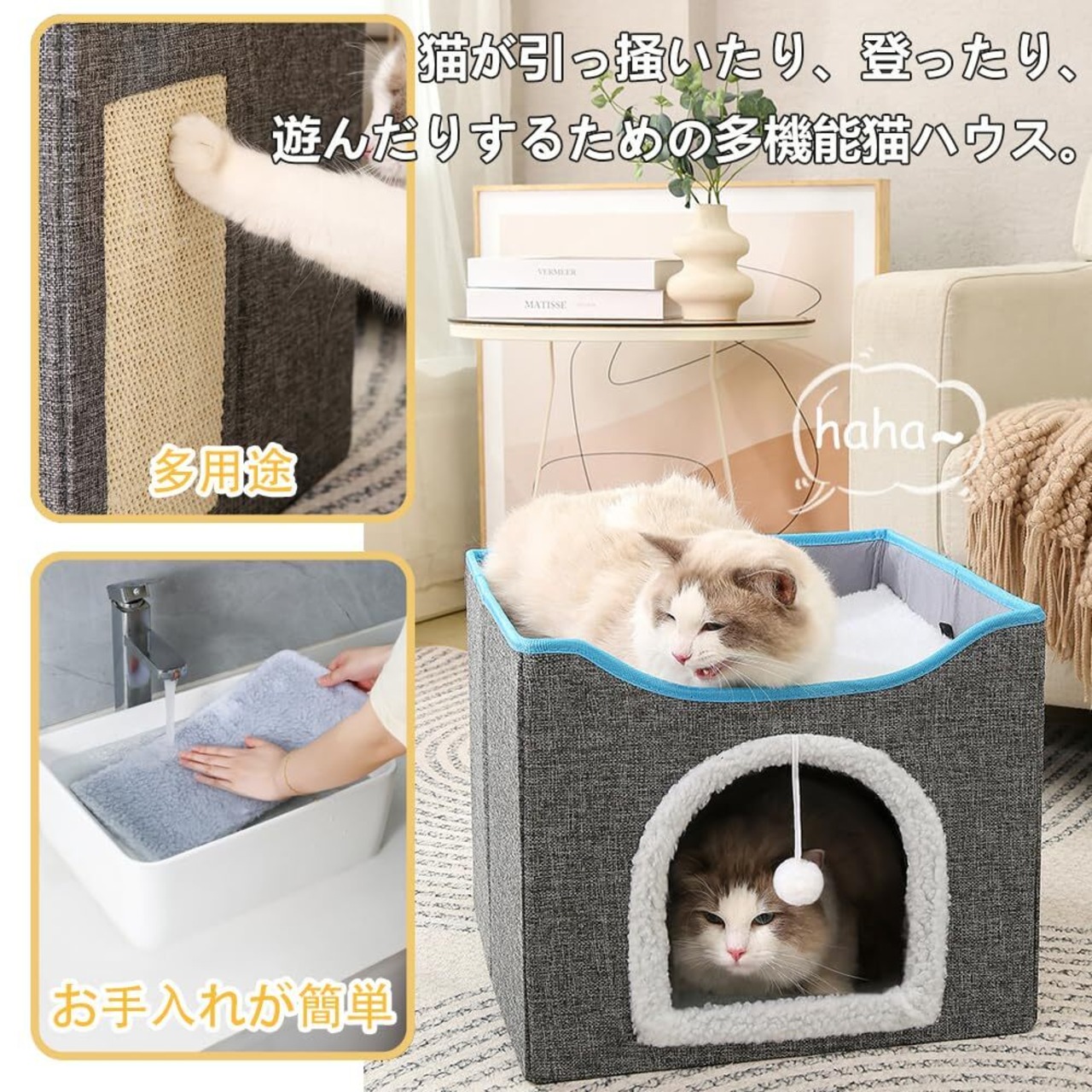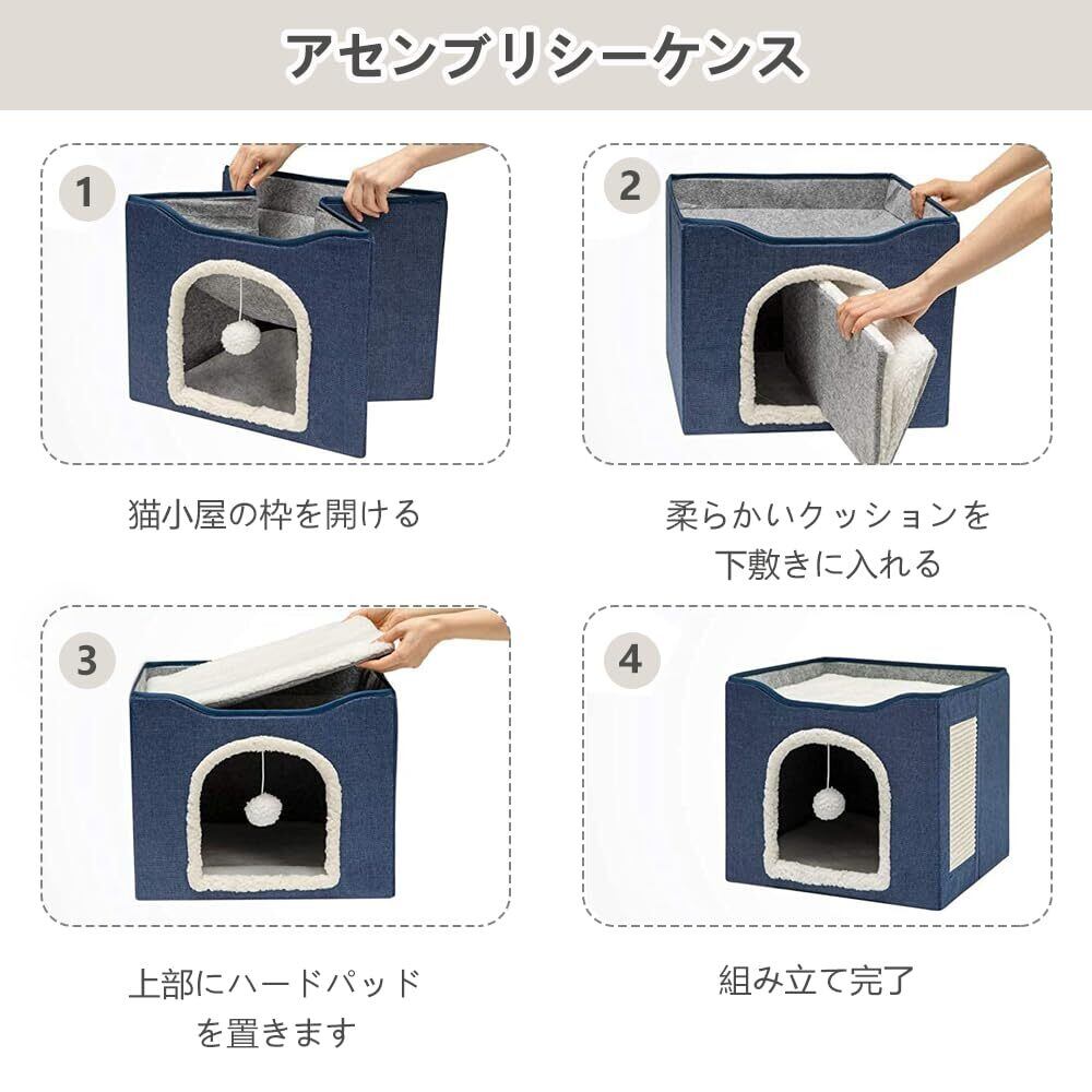 Aikenn 猫ハウス おもちゃ付き 猫の遊び場 ネコの遊園地 ペットベッド 爪研ぎ 滑り止め かわいい 快適 子猫 中型猫 通年 ペット用品 折り畳み可 洗える 二層 つめとぎ 家具破壊防止 爪とぎ 組み立て式 ストレス解消 (ネイビー)