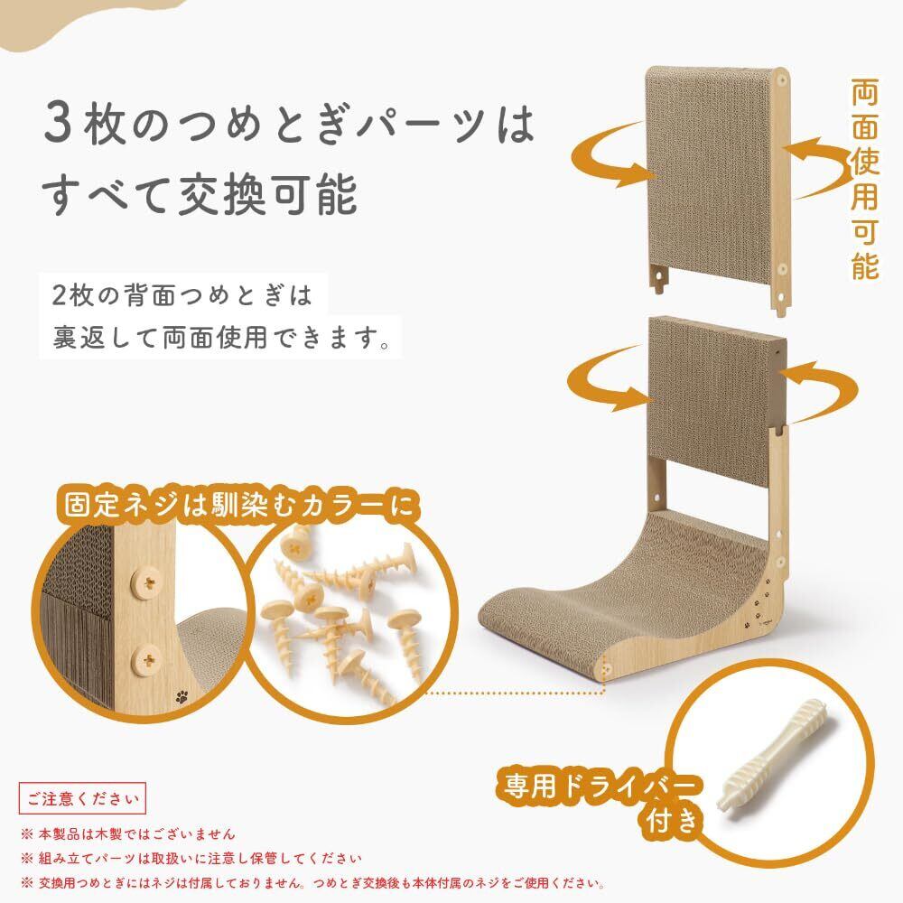 【つめとぎパーツは交換可能。背面つめとぎは裏返し使用も可】 バリバリボード ウッドプレミアムは3枚のつめとぎパーツで構成されており、いずれもつめとぎパーツのみの交換が可能です。2枚の背面つめとぎは裏返しても使用できます。傷んだ部分だけを交換しながら、自分のにおいの染み込んだ、お気に入りのつめとぎを長くお使いいただけます。 まるごと買い替えが不要なので経済的で、猫と暮らすあなたにも嬉しく、環境にも優しい仕様です。 ※つめとぎパーツと外枠はプラスチックネジで固定する仕様です。