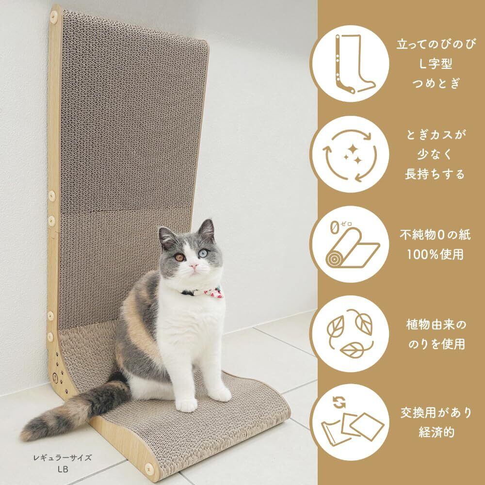 【研ぐ時にガタガタしない!壁に沿うプレミアム仕様で安定感も抜群!】 バリバリボードシリーズは、壁などの平坦で広い場所で立ってのびのびつめとぎ派の猫におすすめのL字型つめとぎです。 バリバリボード ウッドプレミアムは、猫工学に基づき、猫がつめとぎをする時に力がかからない位置に板の接合部がくるよう工夫をし、さらに日本の猫の生活シーンに合わせて壁の下部にある巾木に当たらないように形状をデザインしているので、安定感抜群で思い切りバリバリすることが出来ます。