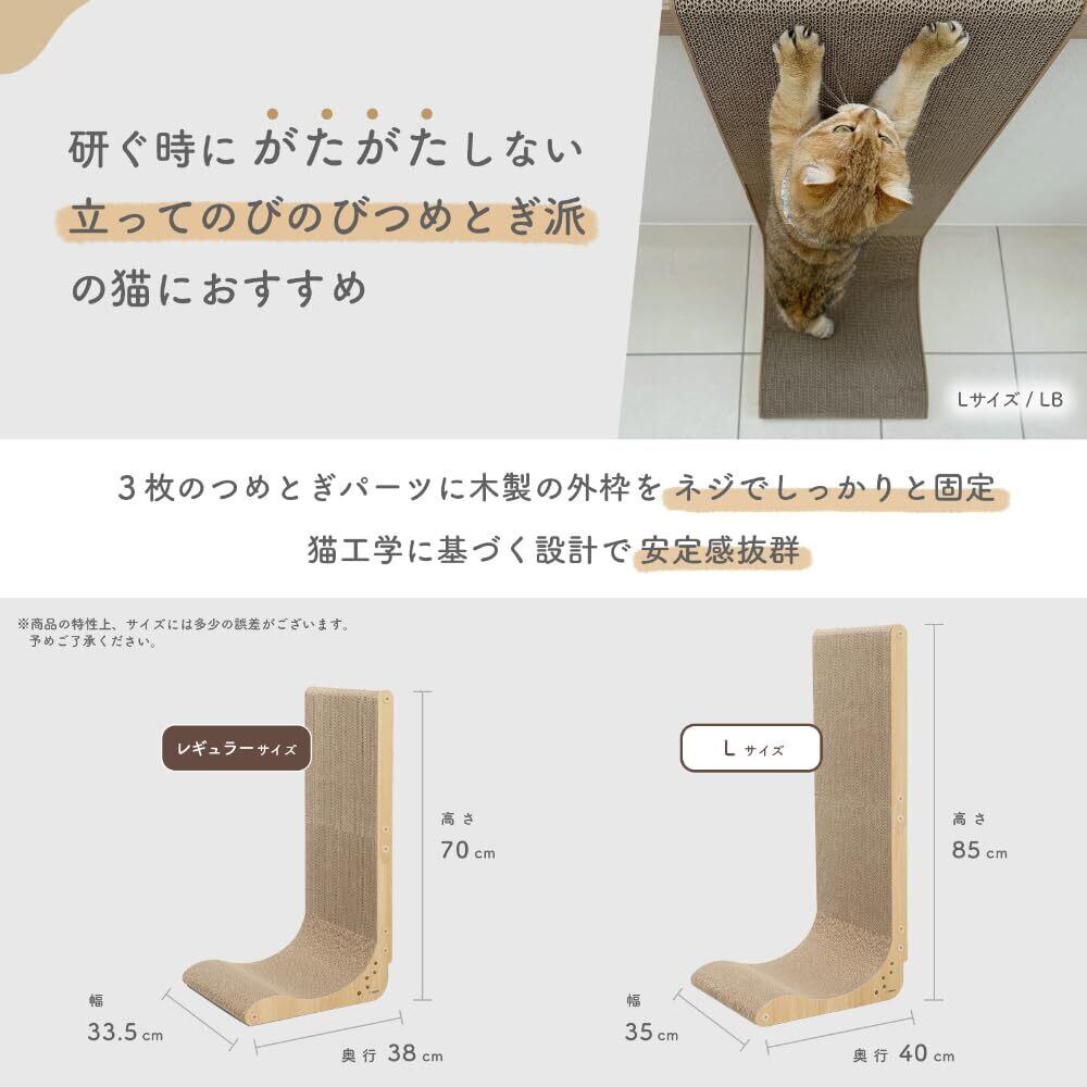 【選べる2サイズ&2カラー】 猫の体格やつめとぎスタイルに合わせてレギュラー・Lサイズの2サイズを揃えています。レギュラーは高さ70cm、Lサイズは高さ85cm。大きめの猫や垂直伸びスタイルが好きな猫にはLサイズがおすすめです。 カラーはライトブラウン・ダークブラウンの2色から、おうちのインテリアや猫の経路に合わせてお選びいただけます。 ウッドプレミアムは外枠が木製(MDF板)でサイドのパネルがなく、スタイリッシュな外観に猫壱のロゴマークを入れたシンプル可愛い木目調デザイン。固定ネジのカラーを外枠と同色にし、全体のデザインによく馴染むよう配慮しいています。
