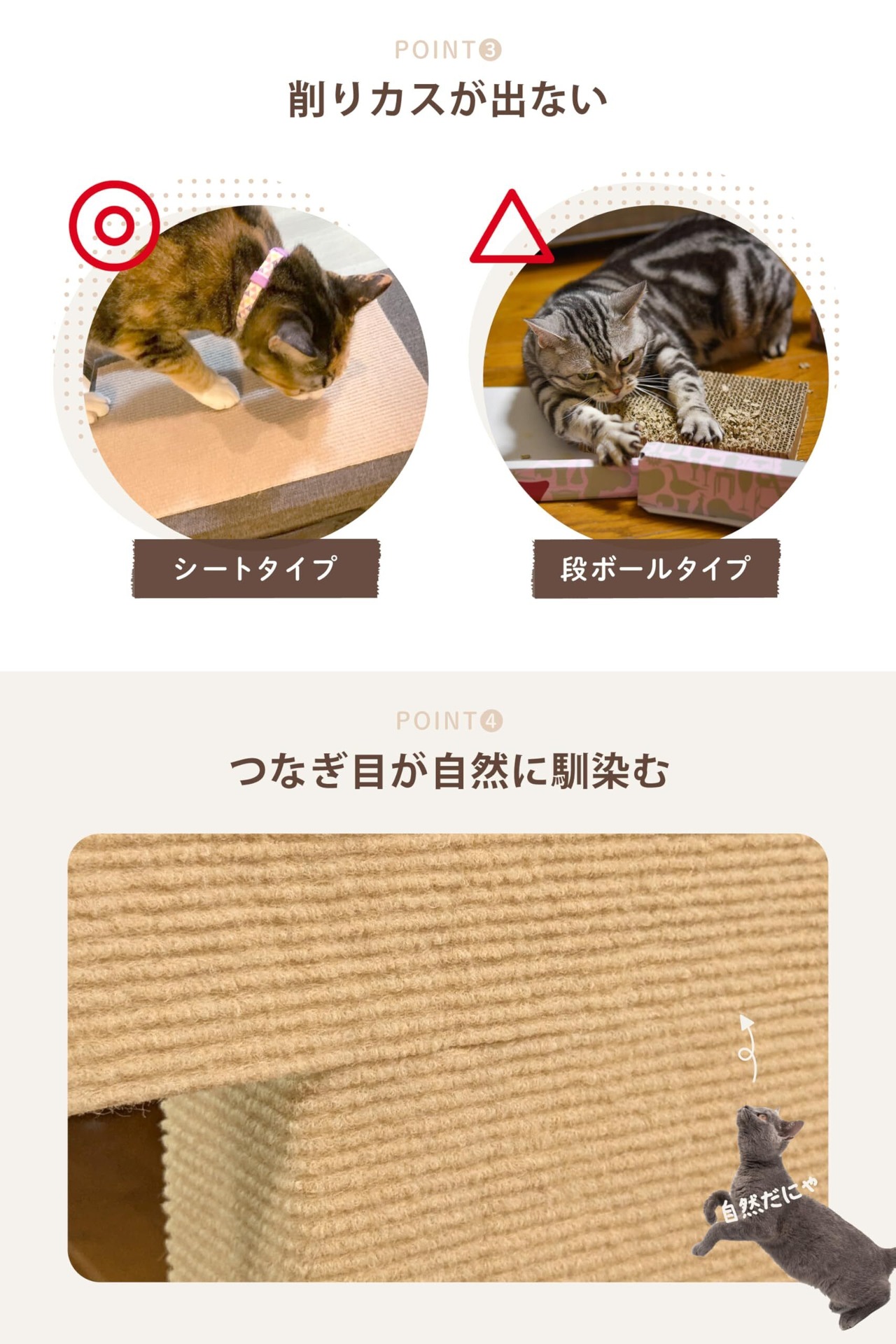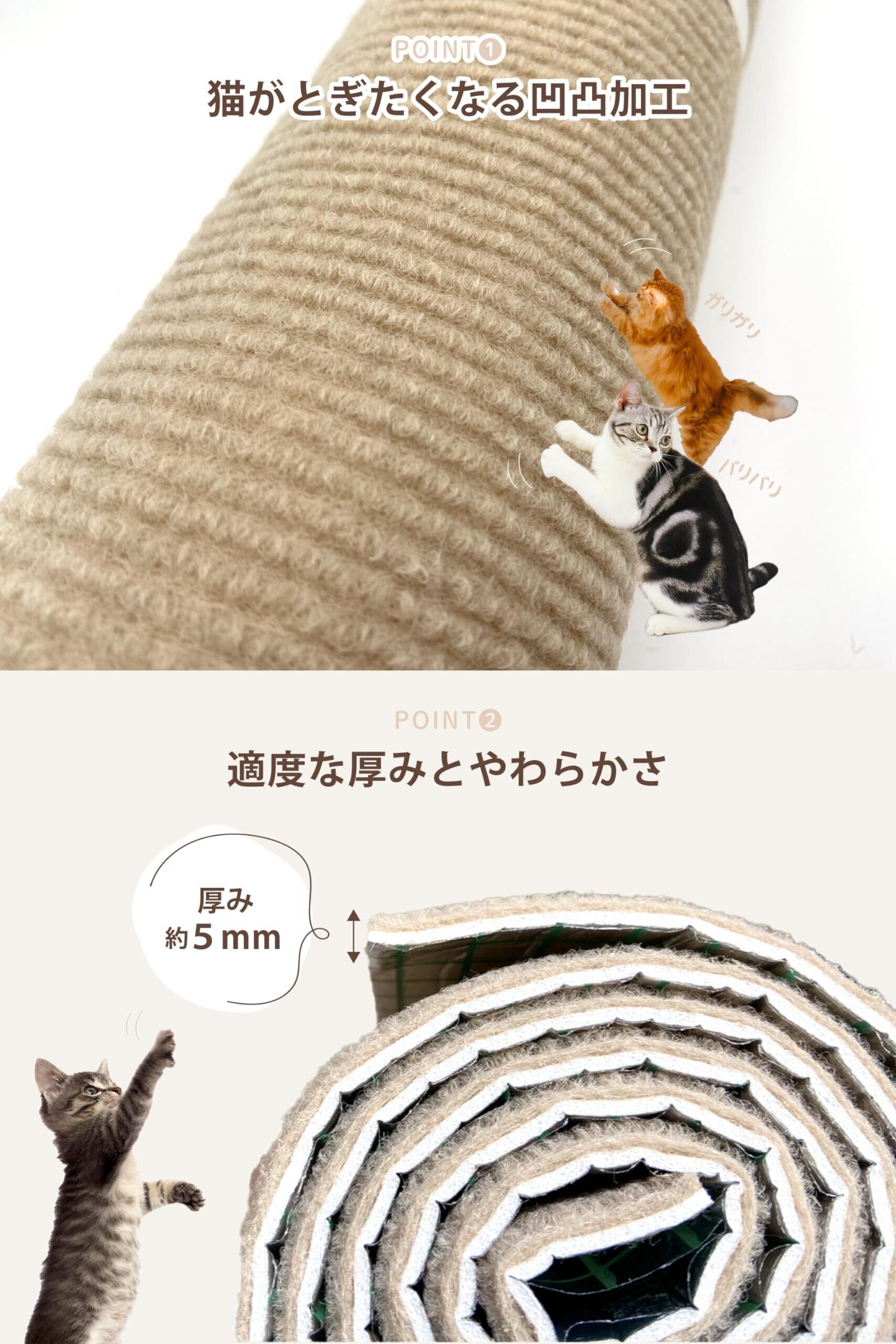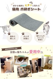 【猫用 爪とぎシートの特徴】猫を飼っている人は誰もが悩む爪とぎ。新しい爪とぎを買っても、家具や壁にバリバリガリガリ。あっという間にボロボロ。そんな悩みもこの爪とぎシートなら好きな大きさにカットしてピタッと貼るだけ。爪とぎをされたくない場所に貼るだけで簡単に傷を防げます。