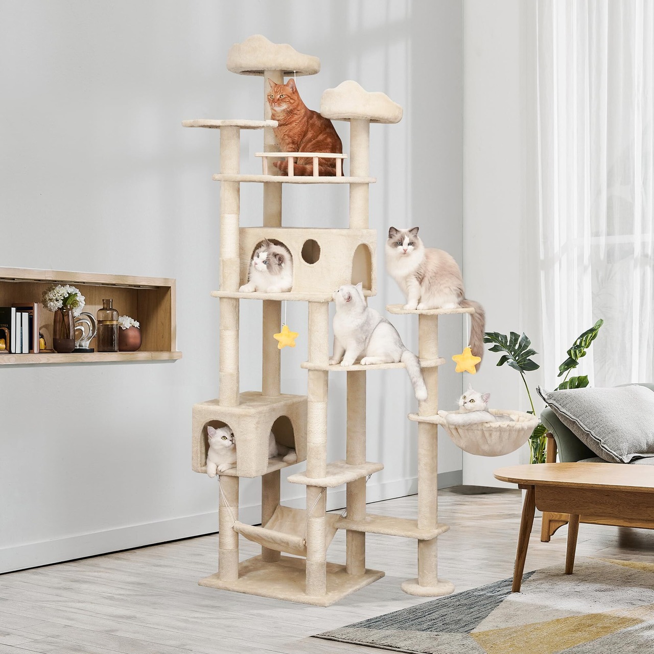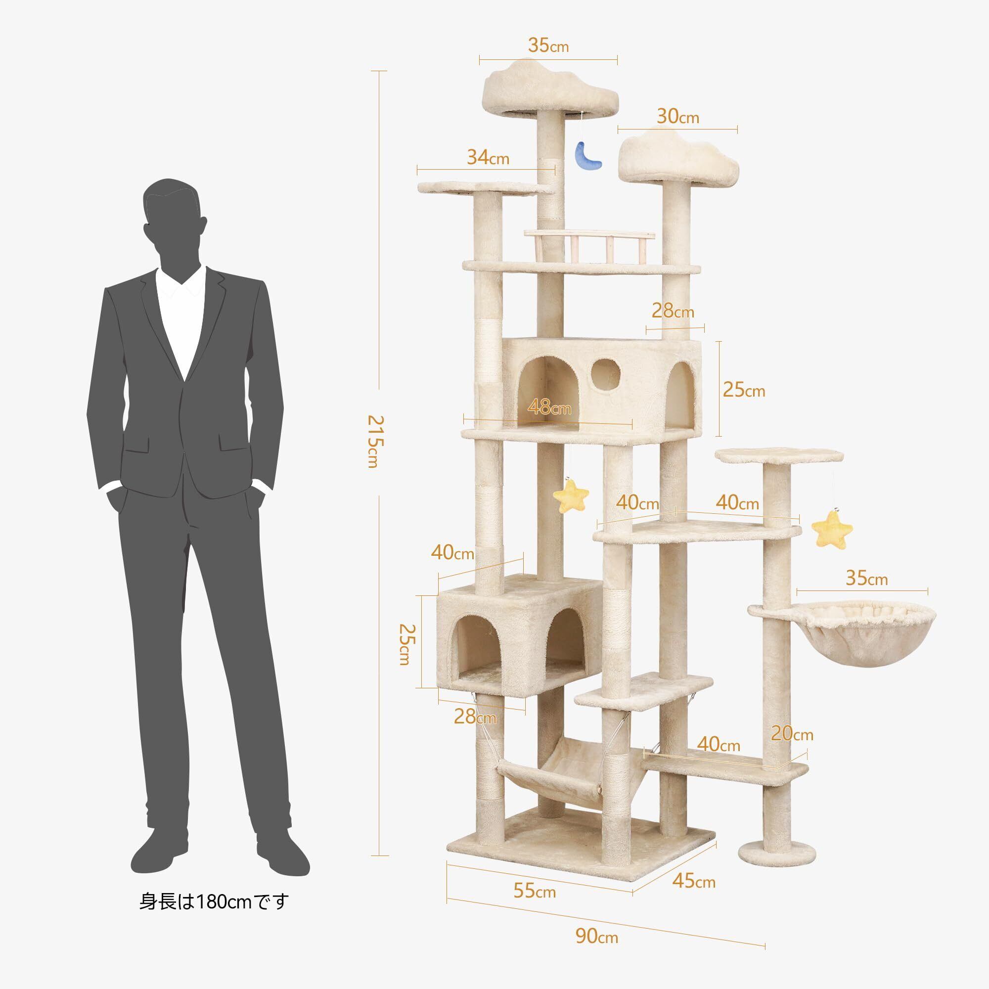 Meecal キャットタワー 大型猫用 猫タワー 多頭飼い 雲型い猫 ベッド 猫 ハウス 広いハンモック 天然サイザル麻爪研ぎポール 見晴らし台 ぬいぐるみ キャット タワー 人気 おもちゃ 可愛 据え置き 転倒防止 運動不足解消 - 高さ215cm ベージュ
