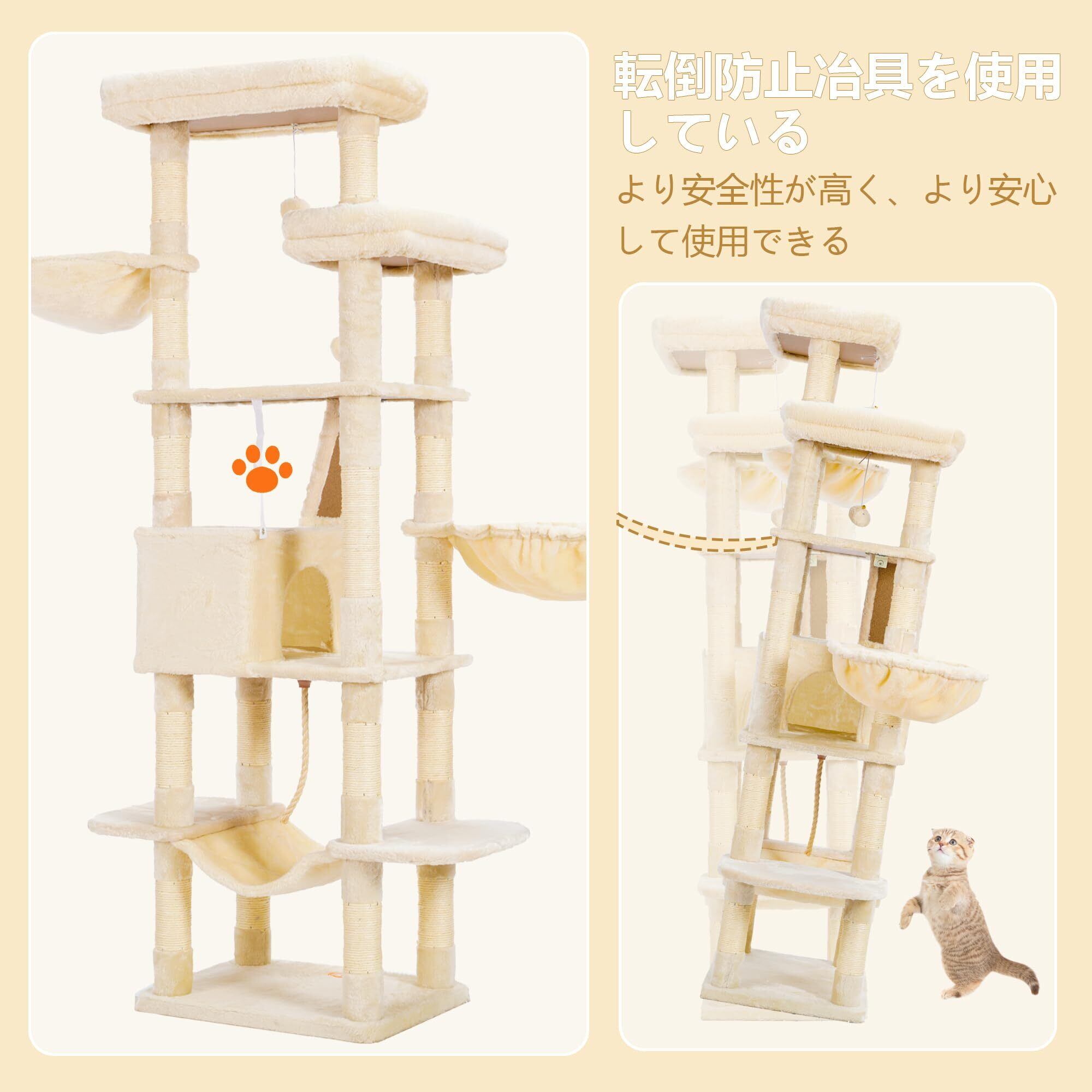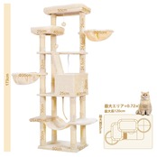 【2022最新】Heybly キャットタワー 大きな猫や多頭飼い 超スリム 据え置き型 省スペース 登りやすい ハンモック2つ 大きな見晴らし台 天然麻紐 爪研ぎ棒 高さ173cm ベージュ HCT025M | wakuwakuland