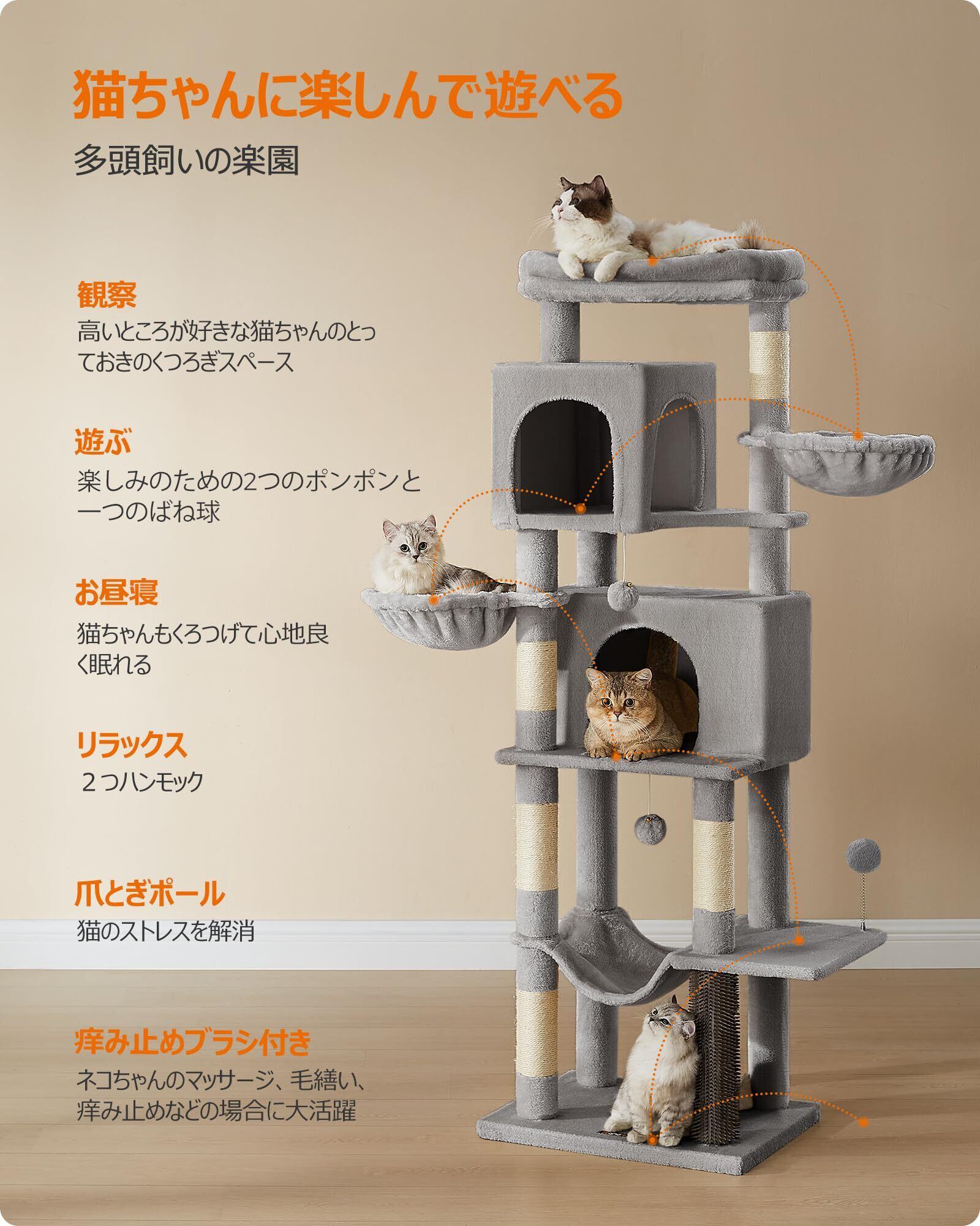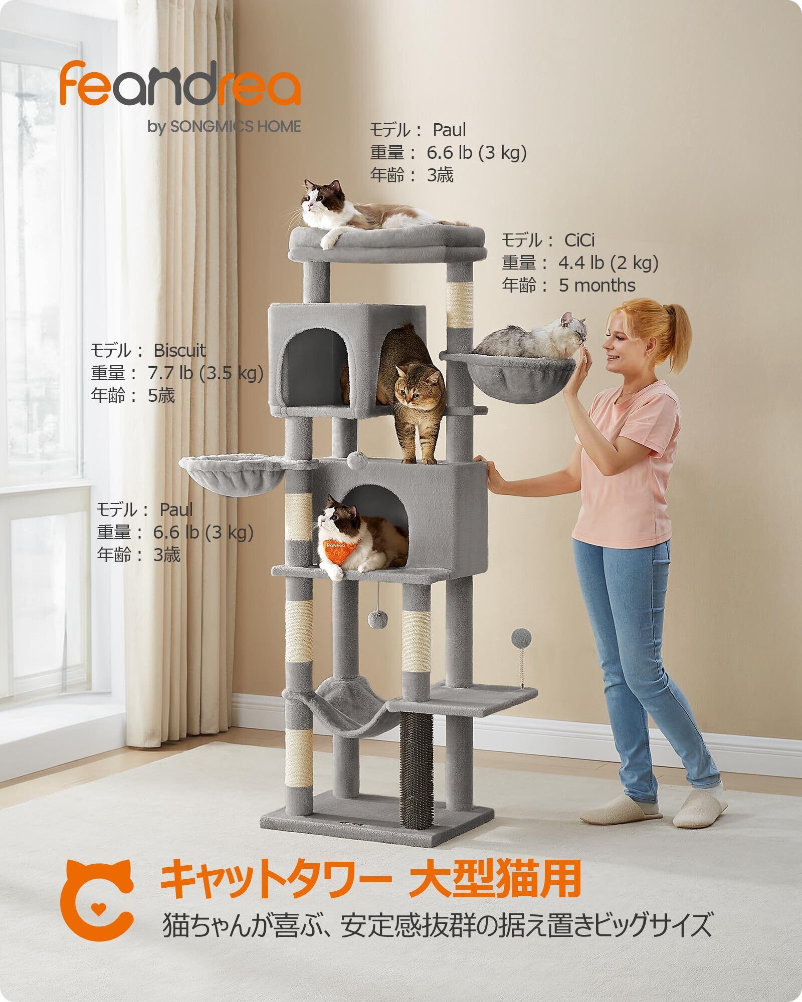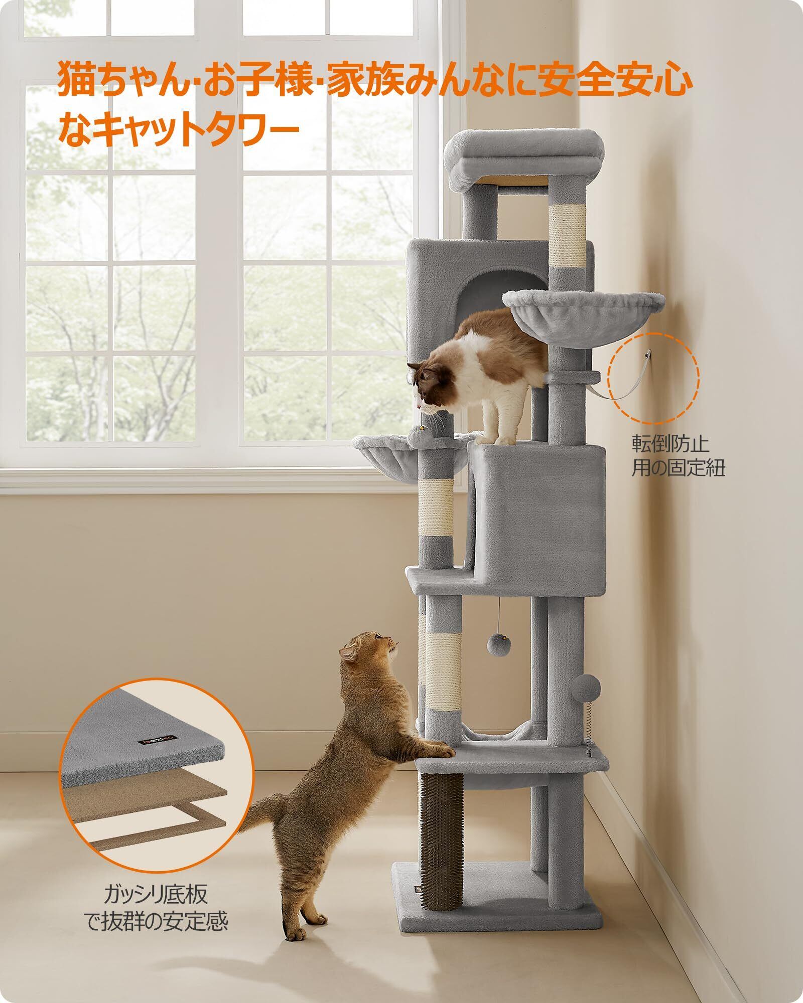 FEANDREA キャットタワー 猫タワー スリム 大型猫用 多頭飼い 据え置き 登りやすい 省スペース ハンモック 見晴台 ねこハウス ボンボン 天然麻紐 グレー 高さ175cm 猫用キャットタワーが新登場 PCT182G01