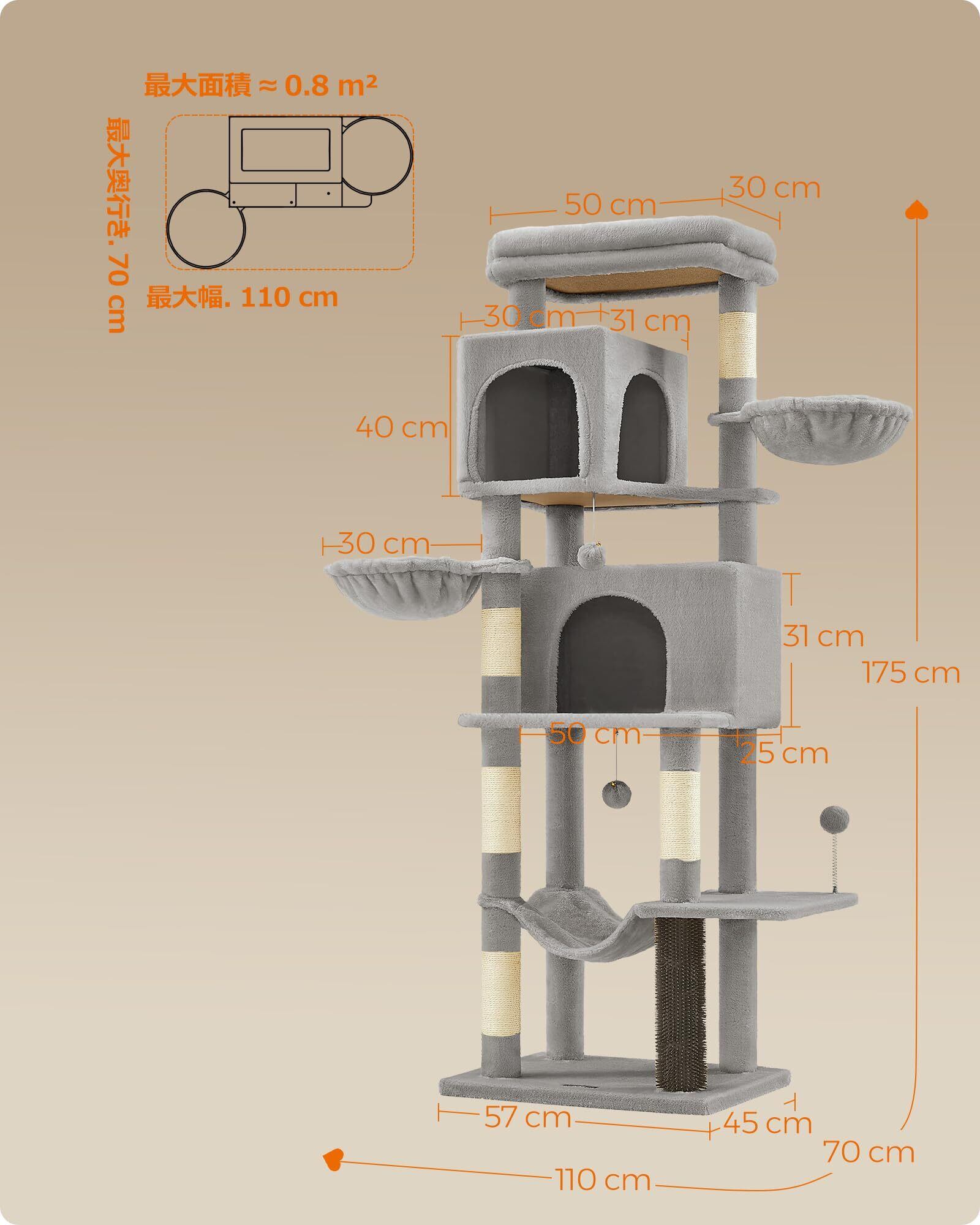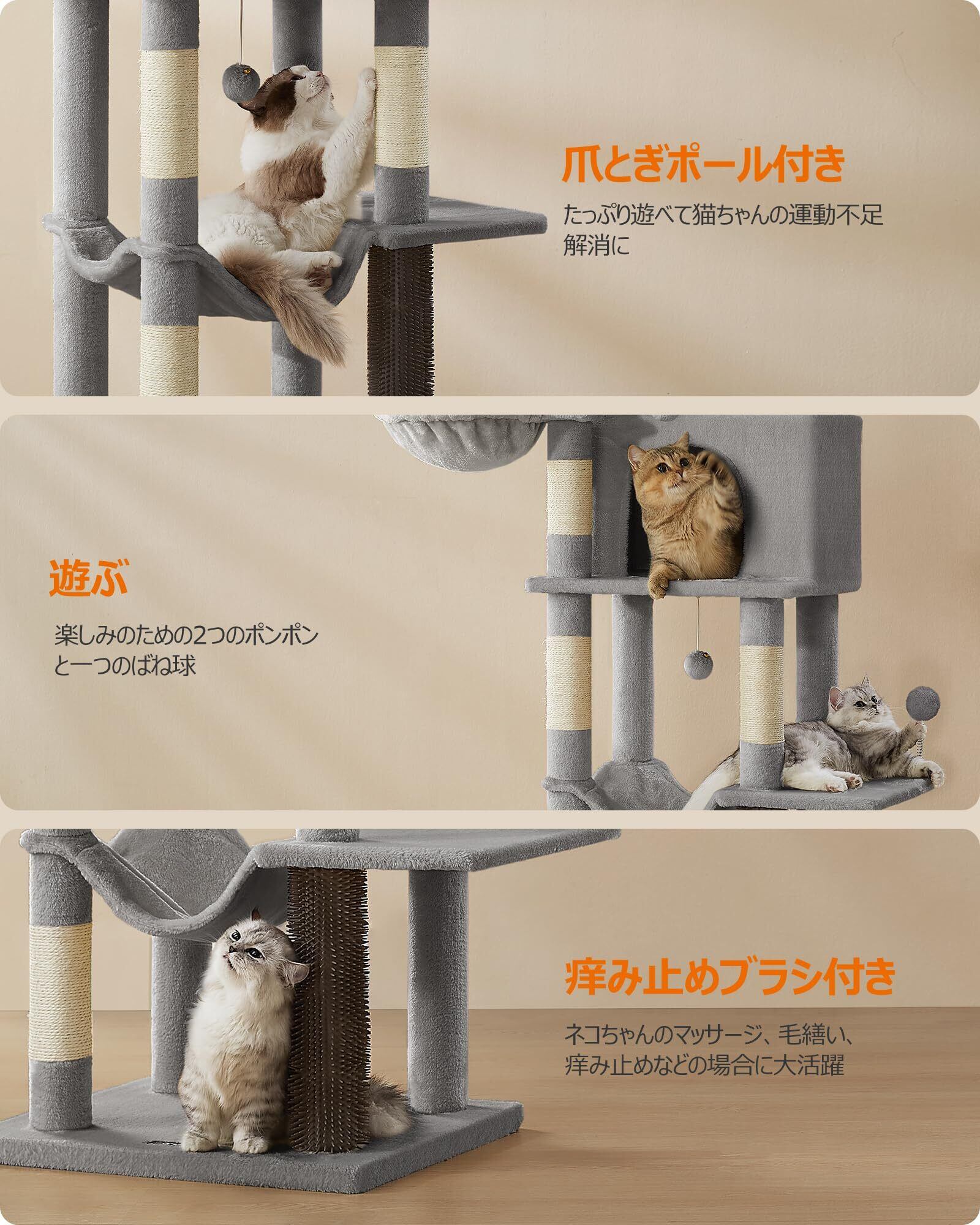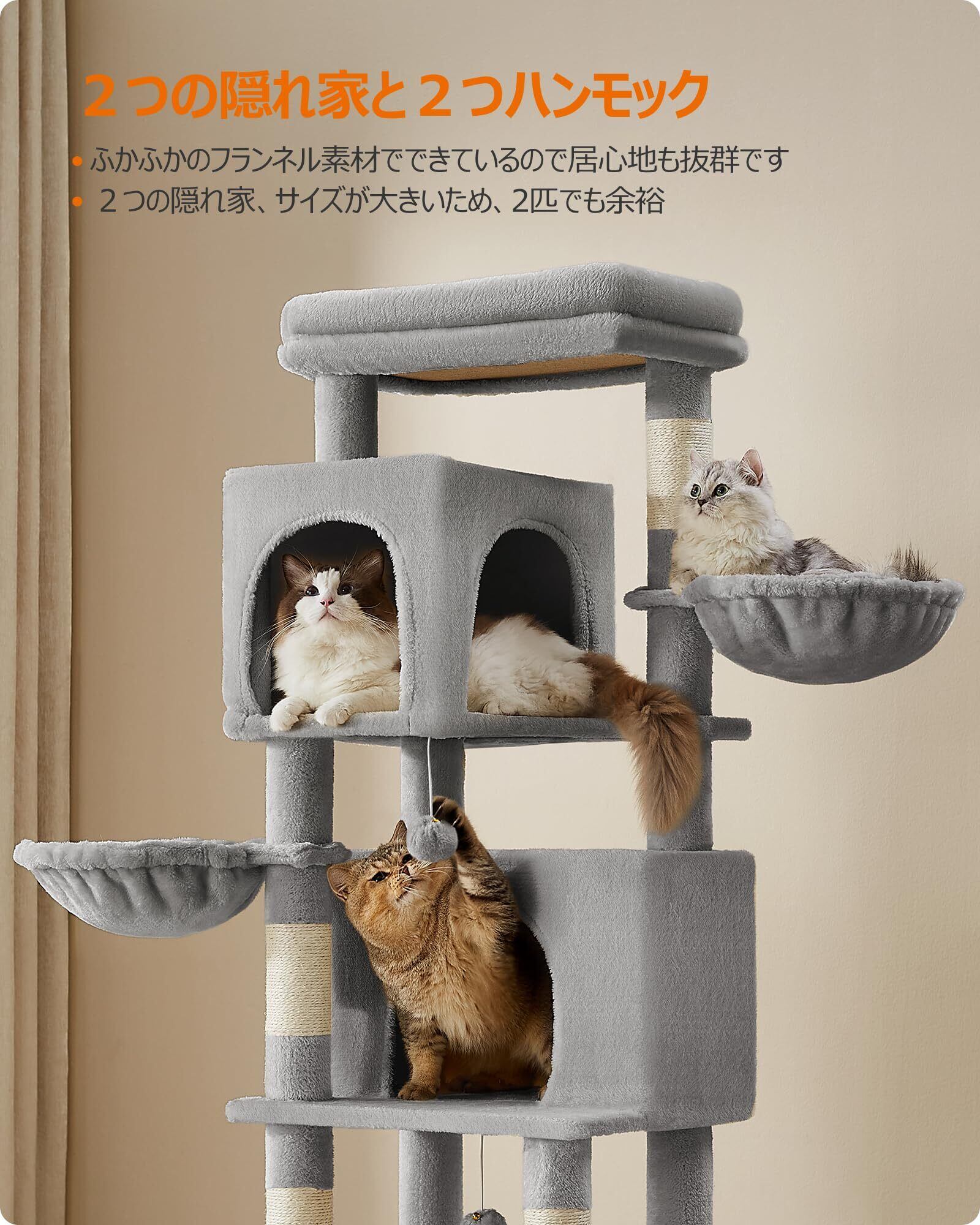 FEANDREA キャットタワー 猫タワー スリム 大型猫用 多頭飼い 据え置き 登りやすい 省スペース ハンモック 見晴台 ねこハウス ボンボン 天然麻紐 グレー 高さ175cm 猫用キャットタワーが新登場 PCT182G01