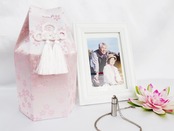 六角タイプの覆い袋(骨壷カバー)です。光に照らされると、編みこまれた金糸(ラメ糸)がきらきらと七色に輝きます。覆い袋は3寸の骨壷を収納可能。