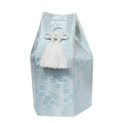 六角タイプの覆い袋(骨壷カバー)です。光に照らされると、編みこまれた金糸(ラメ糸)がきらきらと七色に輝きます。覆い袋は3寸の骨壷を収納可能。