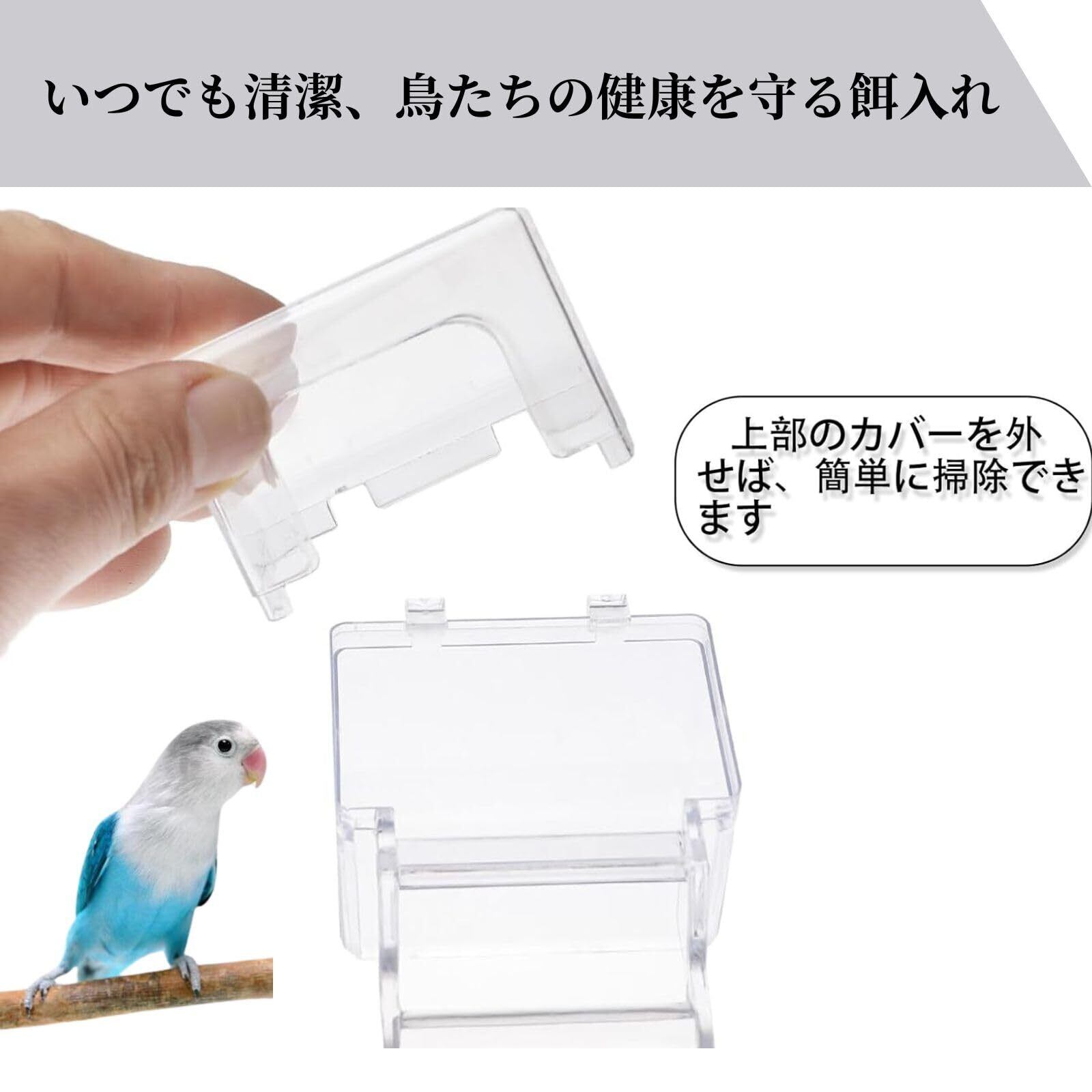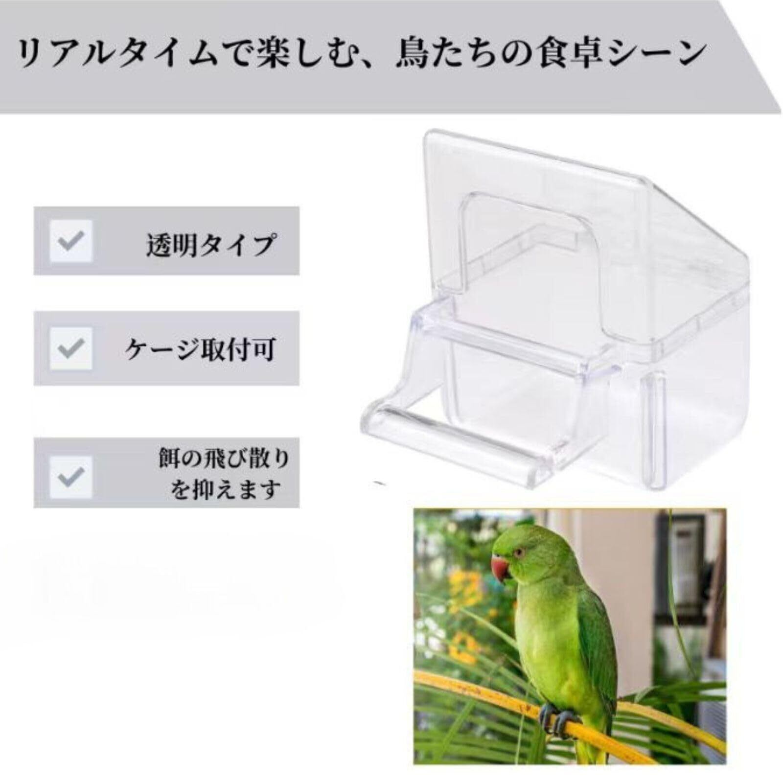 掃除が簡単 透明で中が見えるため、餌の補充や掃除が簡単に行えます。清潔な環境を保ち、鳥たちの健康を守ります。