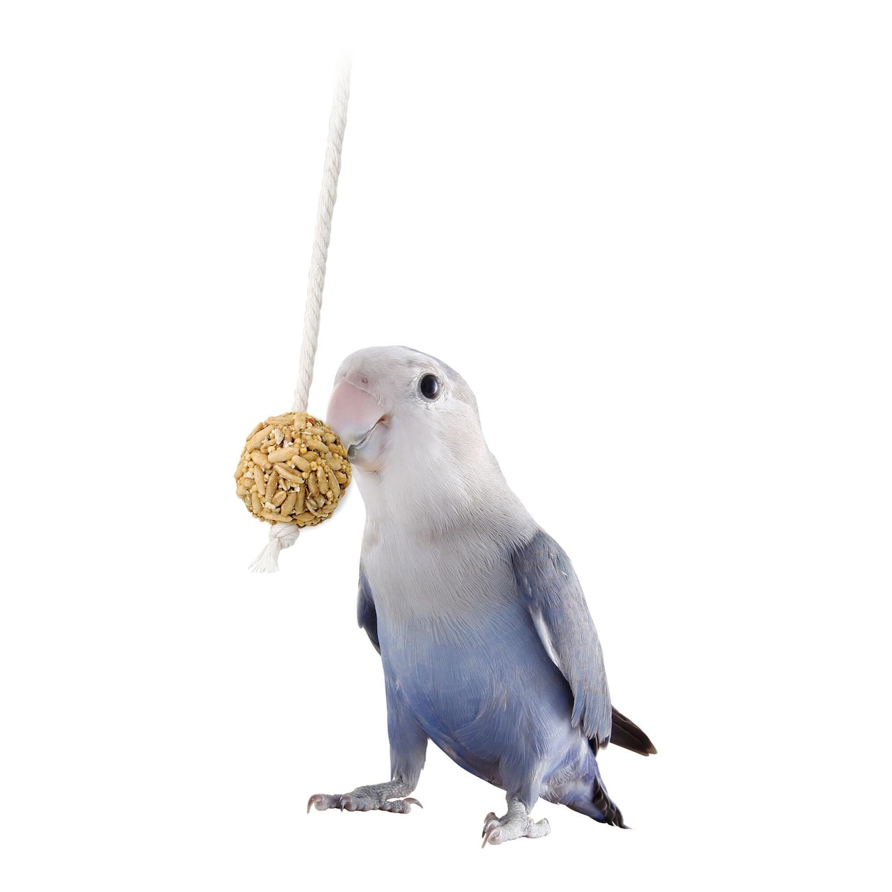 シリアル、フルーツ、カットルボーン、ボレー粉を丸めて固めた食べられるおもちゃです。ケージに吊るせるロープ付きです。