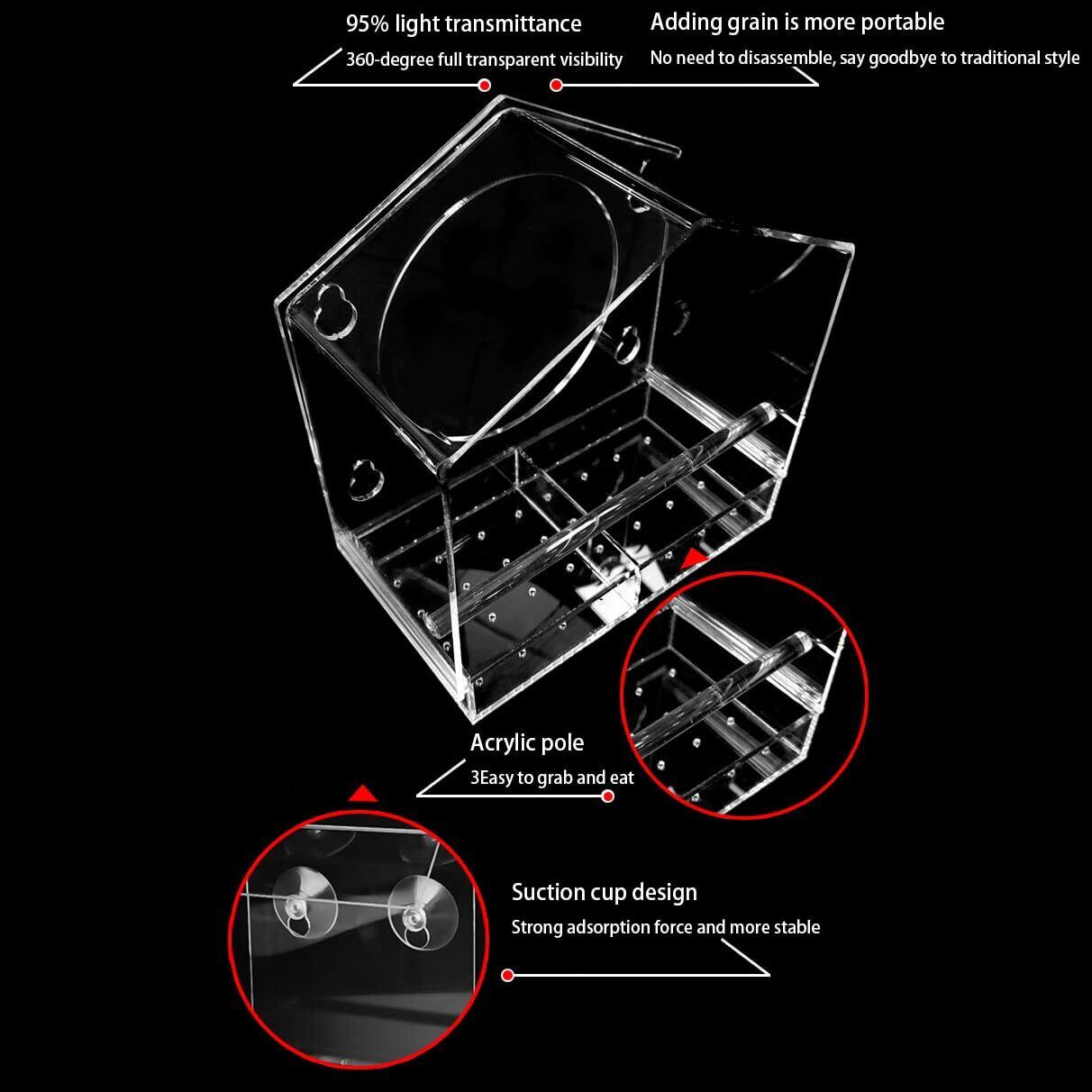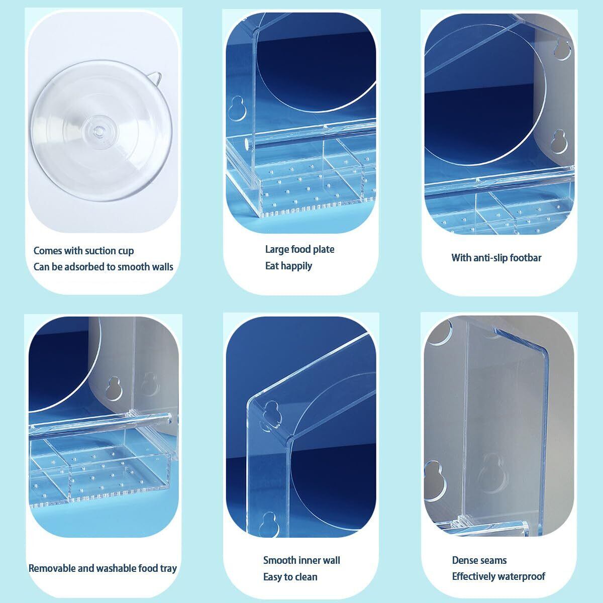 鳥がつかむのに便利な鳥のスタンドを持っていること。 角は滑らかで丸く、鳥が踏み込んだときに怪我から効果的に保護しており、透明な観察は鳥の食べ物に便利です。 鳥が食べるとき、彼らは時々食べ物をつつきます。 上部カバーのスプラッシュプルーフと漏れ防止設計は、無駄を避けることができます。