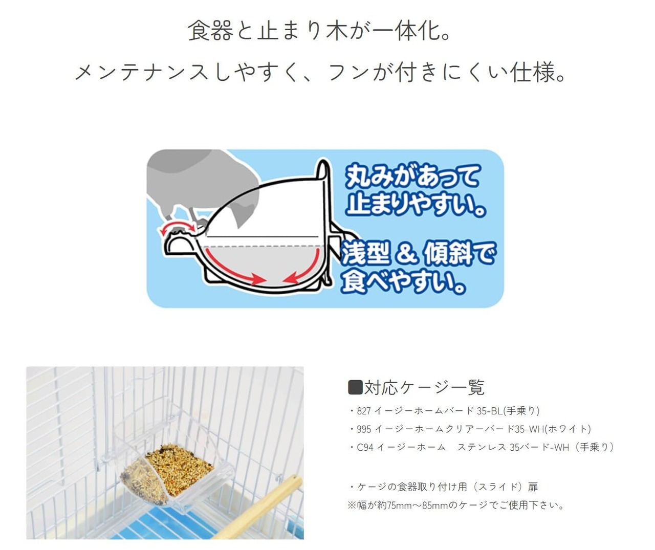 小鳥にやさしい専用食器: イージーホームバードシリーズのケージに最適な食器です。丸みを帯びた浅い形状で、食べ物を取りやすくなっています。