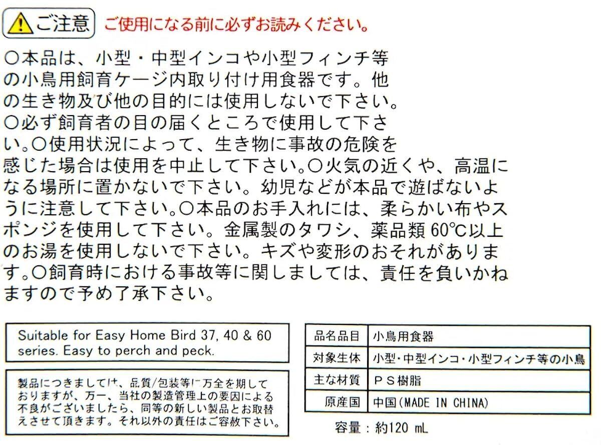 小鳥にやさしい専用食器: イージーホームバードシリーズのケージに最適な食器です。丸みを帯びた浅い形状で、食べ物を取りやすくなっています。