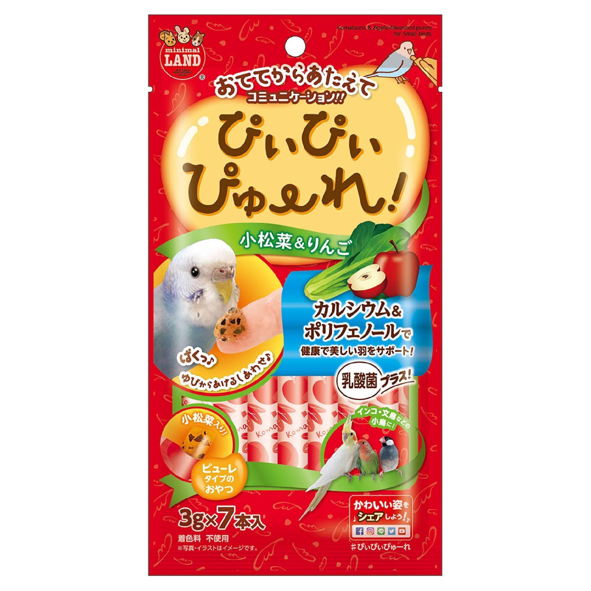 【特長】小鳥用の小松菜&りんごのぴゅーれです。ポリフェノール配合で、健康で美しい羽をサポートします。カルシウムが豊富な小松菜とおなかにやさしい乳酸菌入り。手から与えてコミュニケーションを取ることができます。