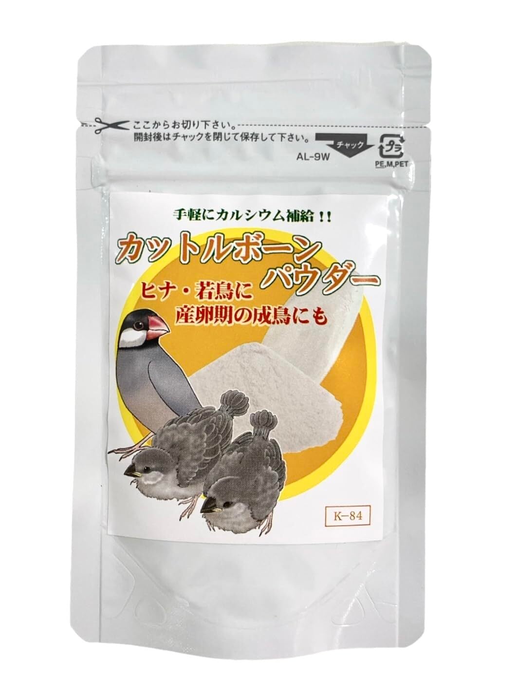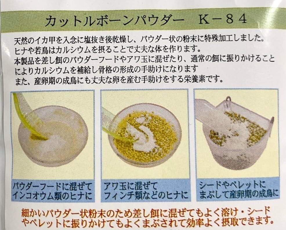 天然のイカ甲を入念に塩抜き後乾燥し、パウダー状の粉末に特殊加工。 インコ・オウム類はもちろん今までカットルボンは囓りづらかったフィンチ類にも手軽なカルシウム源として与えることが出来ます。 ヒナや若鳥などには差し餌に混ぜることによりカルシウムを簡単に摂ることが出来丈夫な体づくりの手助けになります。 また、カルシウムは産卵期の成鳥には重要な栄養素です。 通常の餌の上に振りかけ、まぶしてあげることで産卵中のメスのカルシウム摂取量を増やしてあげることが出来ます。