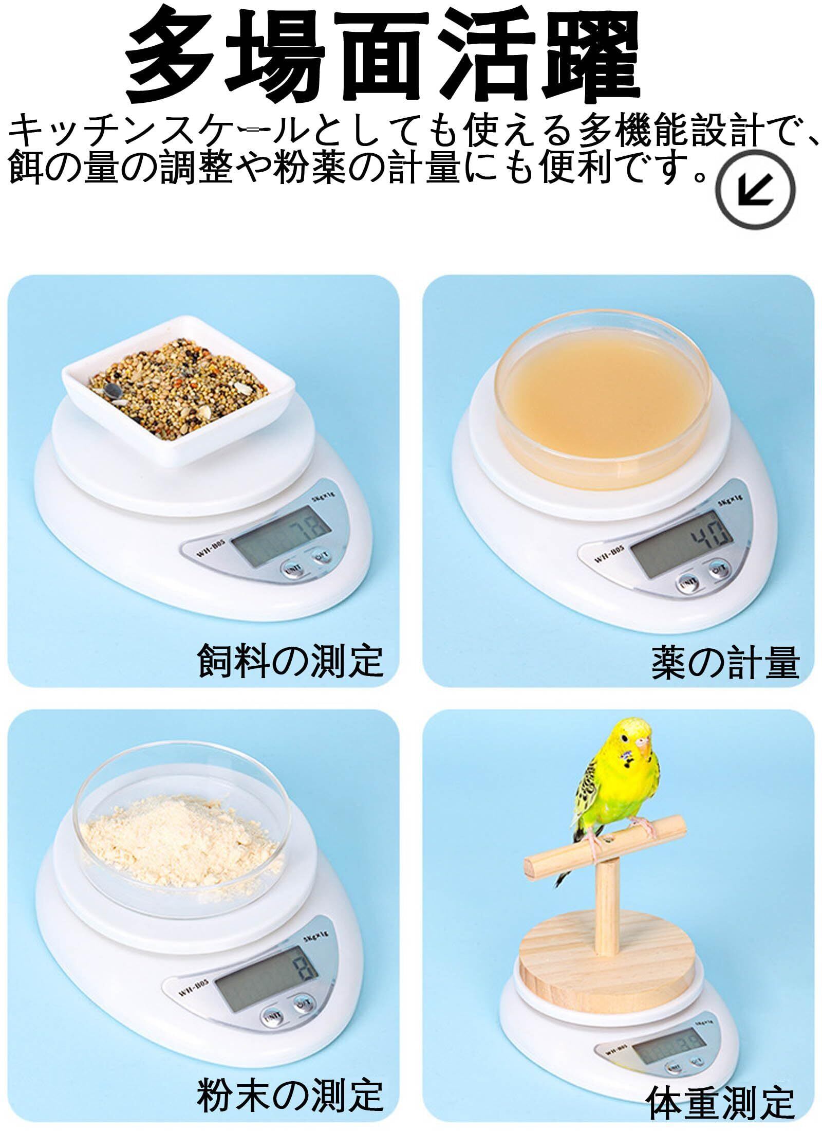 【多機能デジタル計量器】小型で軽量なデジタル計量器は、キッチンや鳥かごの横に置いても邪魔になりません。0.1g単位の高精度計量で、餌の量や粉薬の重さを簡単に測れます。電池式(2*AAA電池で、別途購入が必要)で持ち運びも便利なため、どこでも使える実用性が魅力です。キッチンスケールとしても使える多機能設計で、餌の量の調整や粉薬の計量にも便利です。
