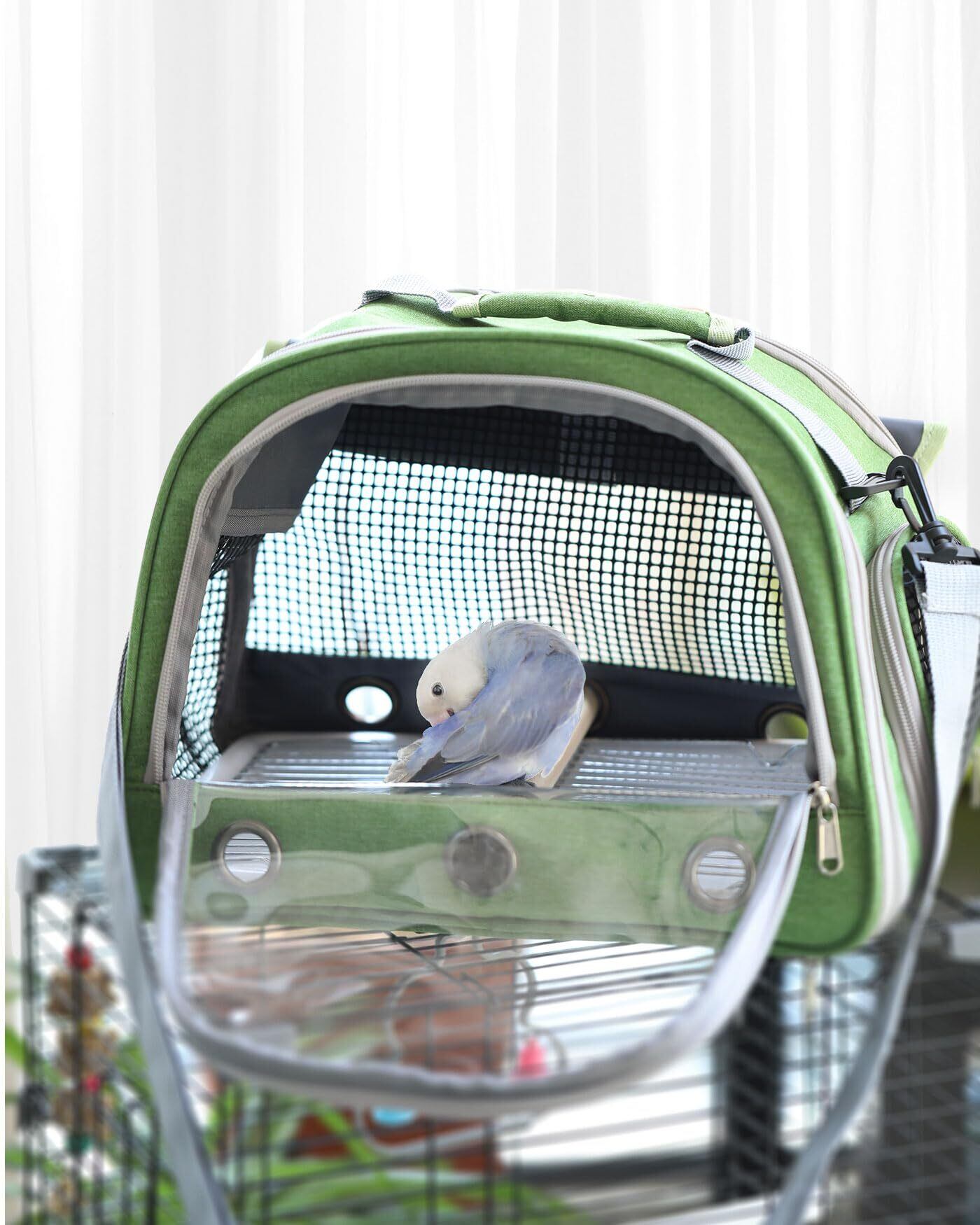 【愛鳥のための移動宮殿】広視界の特大透明窓で愛鳥が外の景色を楽しめるのはもちろん、飼い主様もサッと健康状態を確認可能。正面側面のファスナー開口部で、愛鳥のストレスフリーな出入りを実現。シンプルで軽量、散歩・旅行・通院・避難などお出かけに持ち運びやすいキャリーバッグ。
