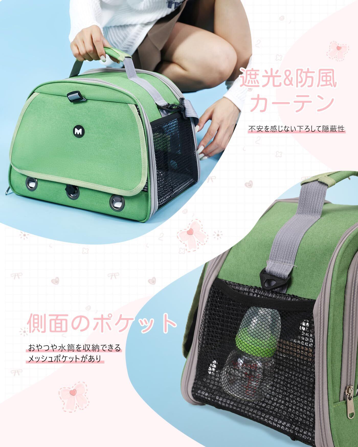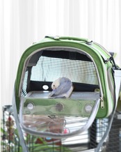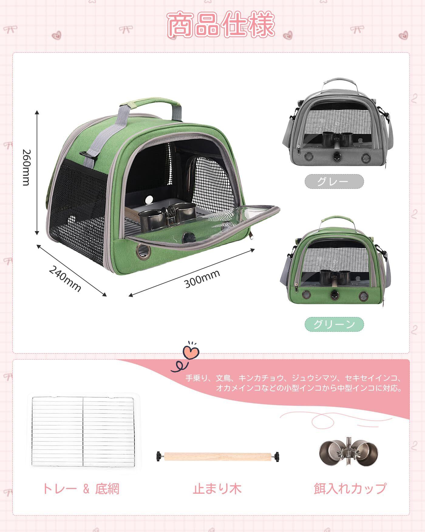 【製品詳細・便利機能】サイズ:30長さ x 24幅 x 26高さcm。止まり木、餌入れカップ、トレー、底網付き。おやつやおもちゃなど小物入り側面のポケットもあり。ハンドルと肩当て付きアジャストストラップで、肩掛け/手持ち自由選択、軽くて持ち運び便利。