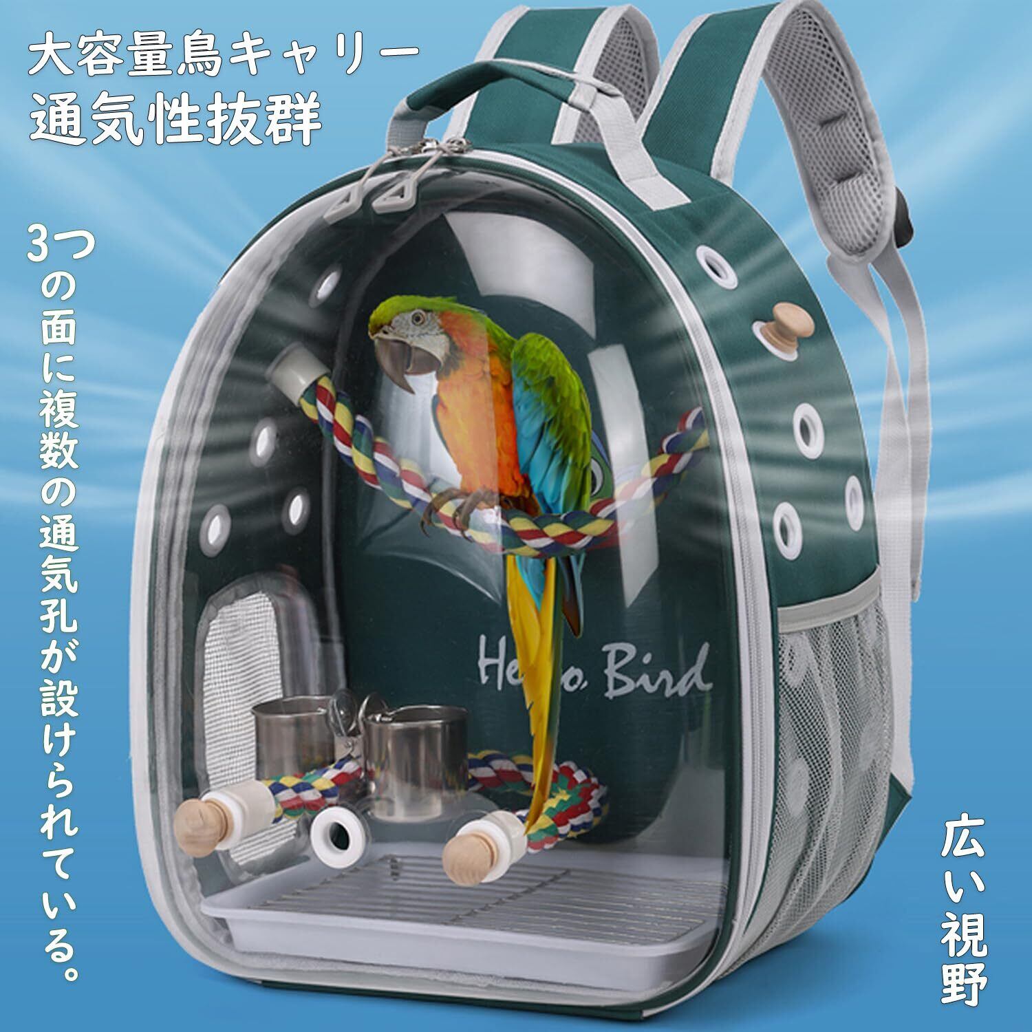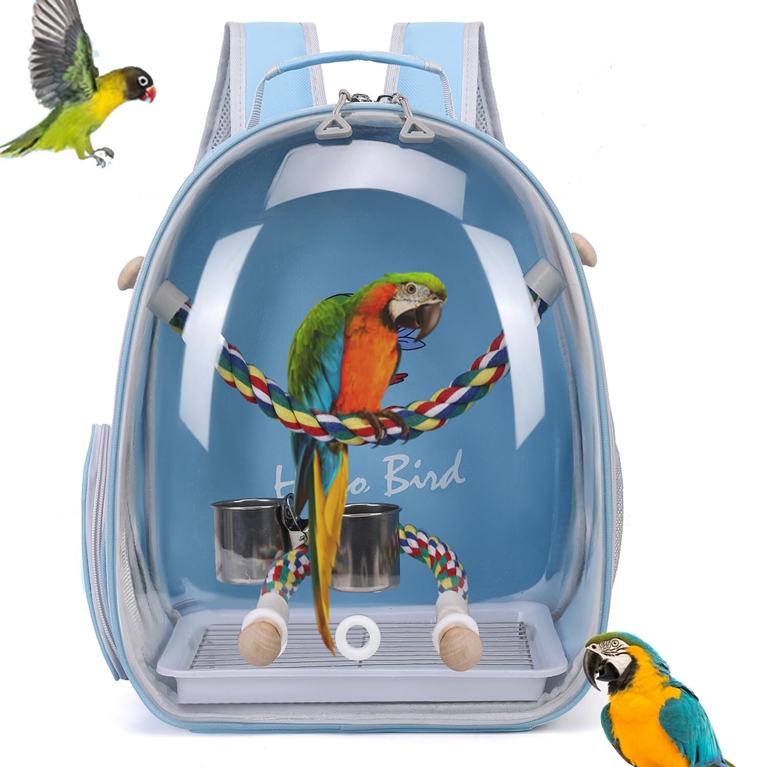 Hopeholic 鳥用 キャリーバッグ 鳥用 インコ キャリー リュック 鳥用 移動用ケージ 文鳥 セキセイインコ オカメインコ キャリーケース とまりロープつき 餌入れ 通気 透明 広い空間 散歩、旅行、避難用の鳥かご (ブルー)