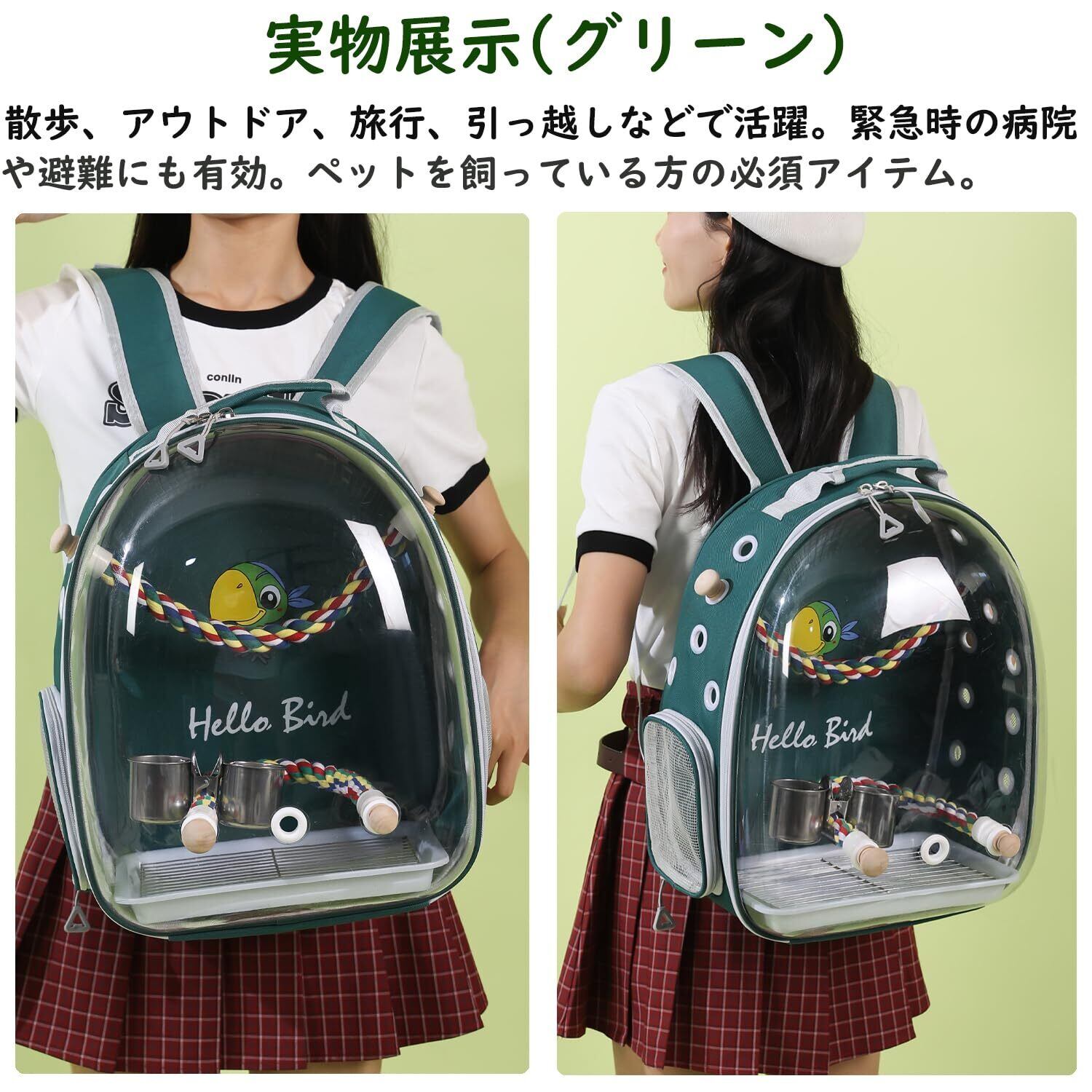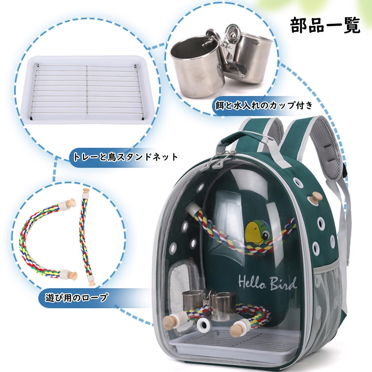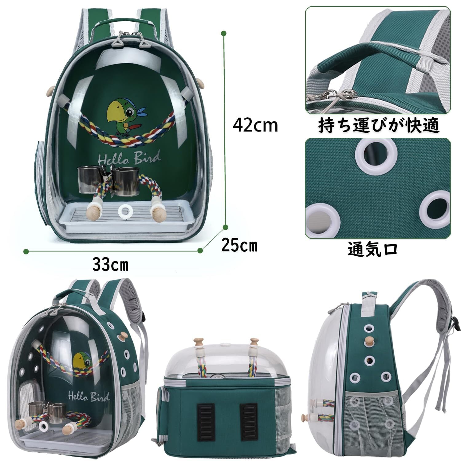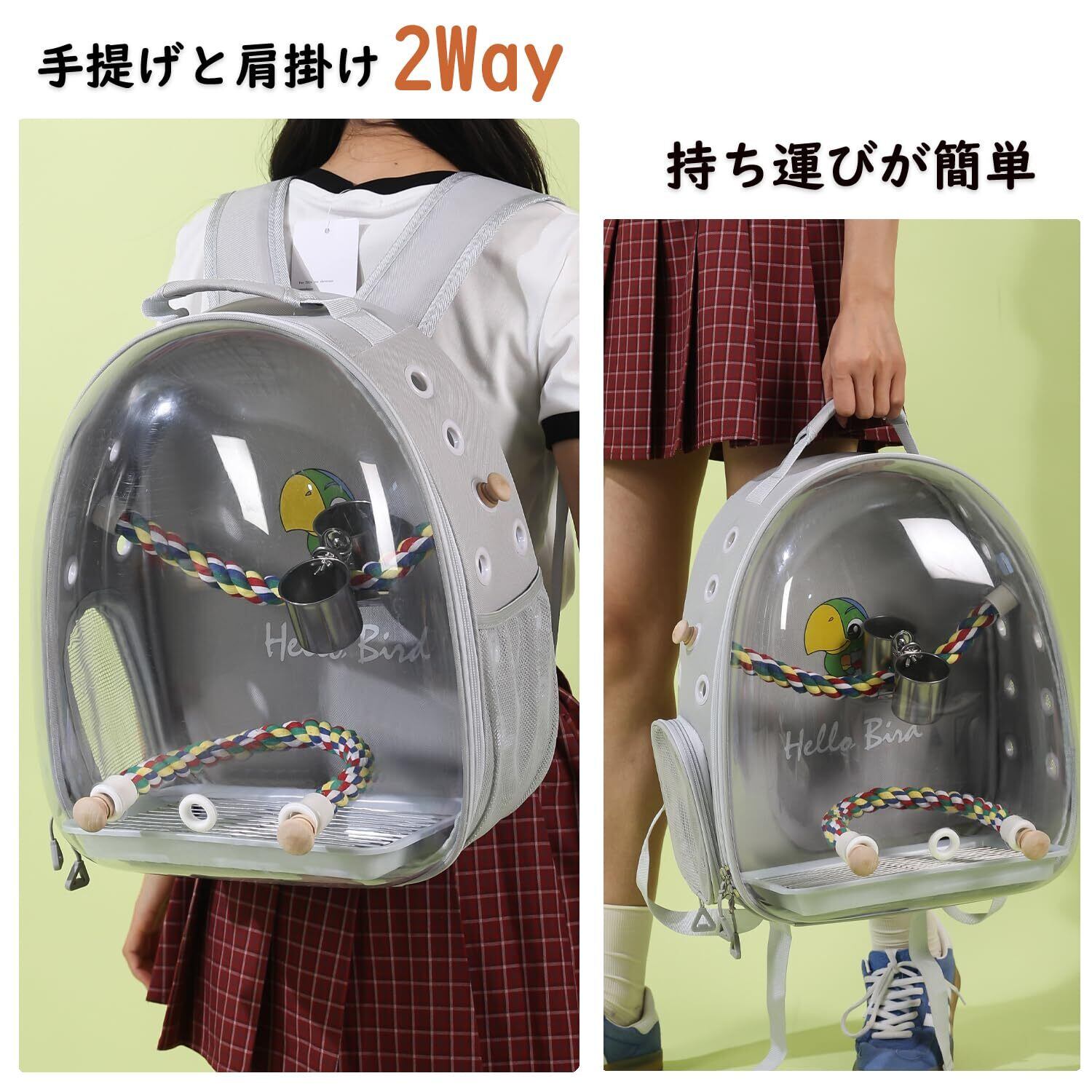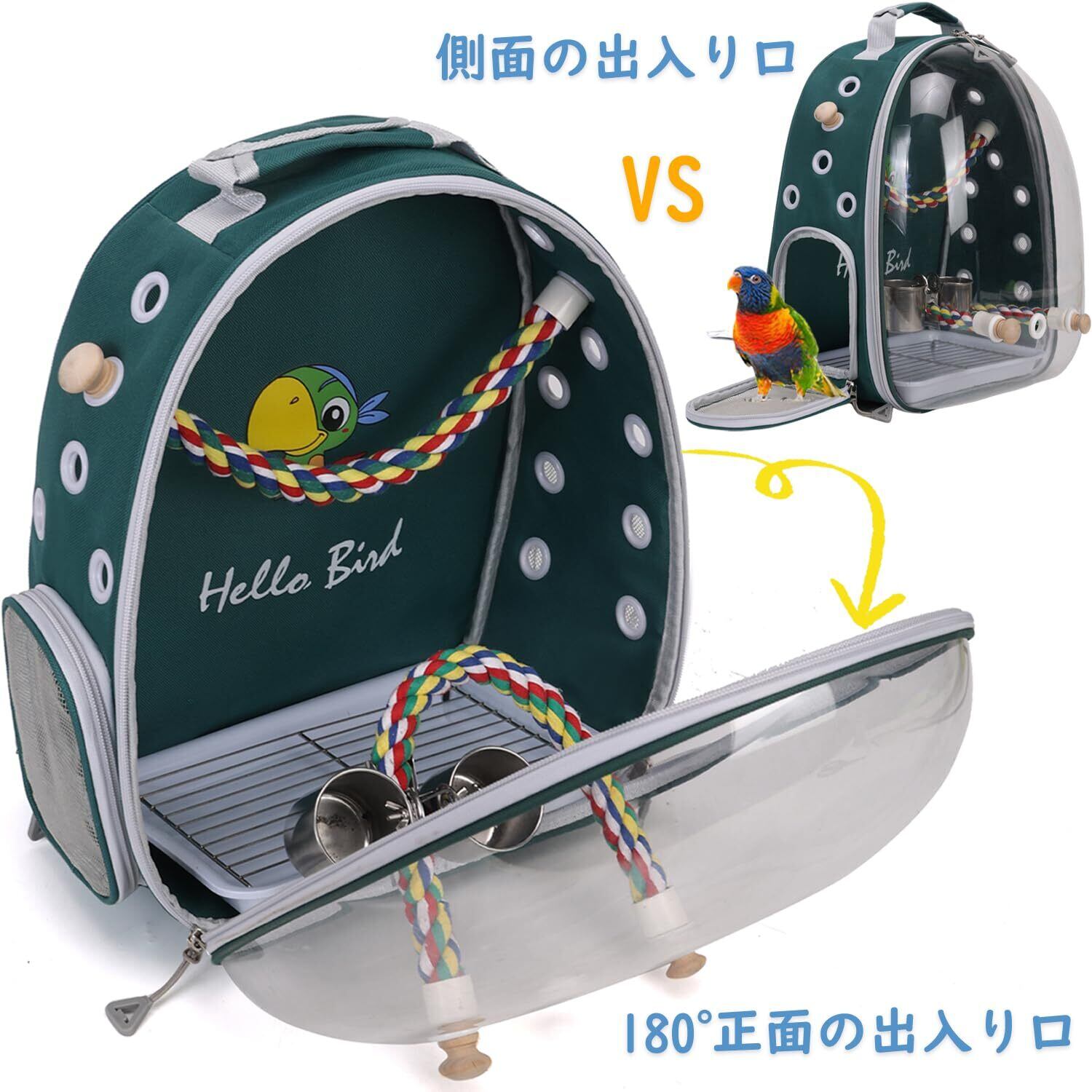 【使いやすい】止まりロープ2本あり、餌入れと水のボトルもつけれます。キャリーの下面にトレーが入っているのでキャリーの底が汚れず掃除がしやすいです。キャリーバックの側面でポケット付き、鳥の餌やおやつ、必要なアクセサリーを簡単に収納でき、お出かけ時に便利です。
