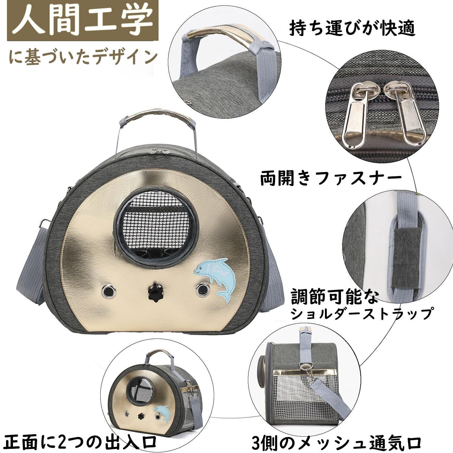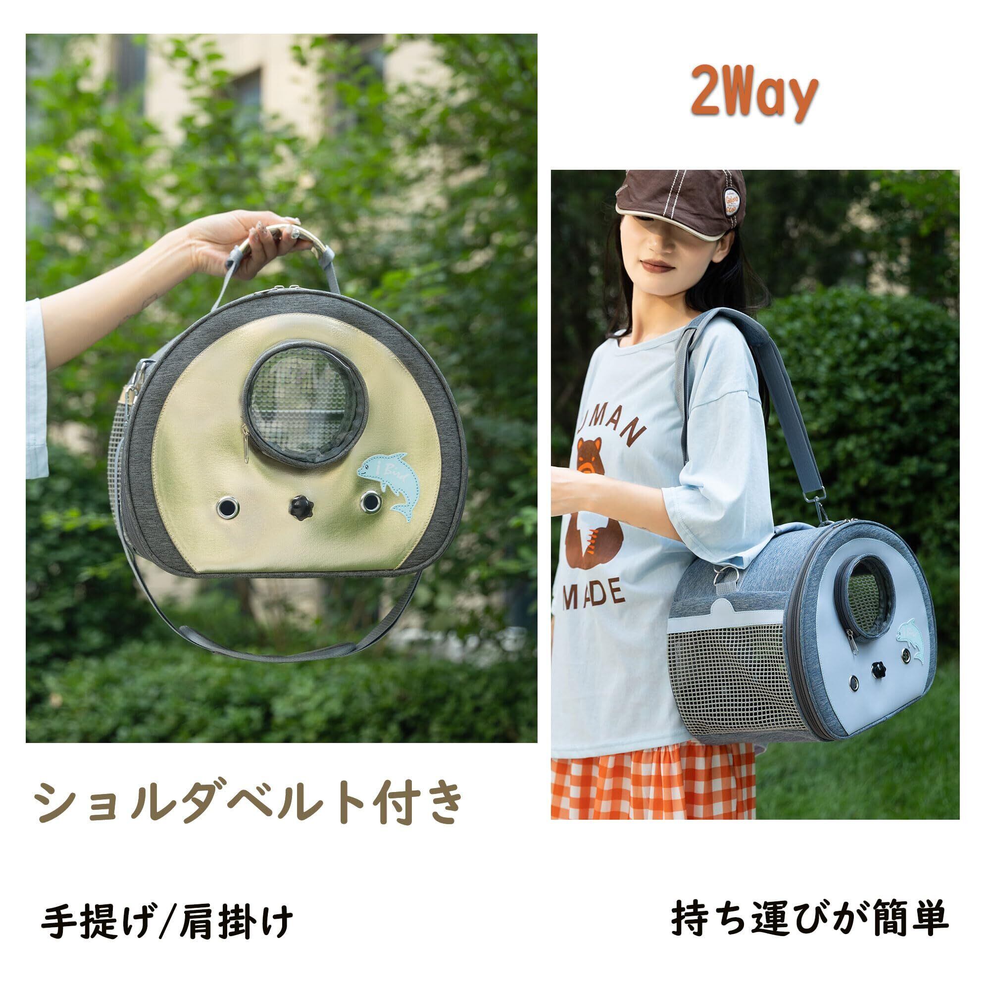 手提げ/肩掛け 2Way:手提げと肩掛けの両方に対応しています。短時間の移動や鳥が不安定な場合は手提げ、長距離移動や荷物が多い場合は肩掛けが便利です。状況に応じて使い分けできるため、快適に鳥とお出かけいただけます。